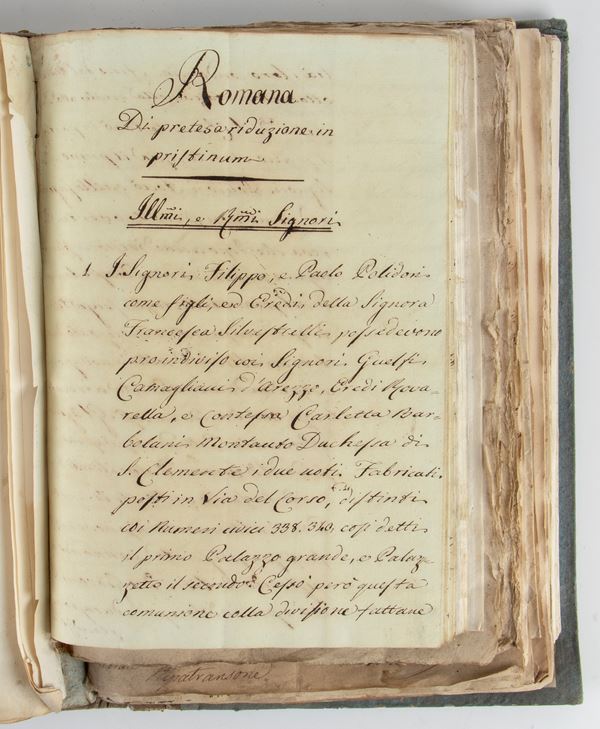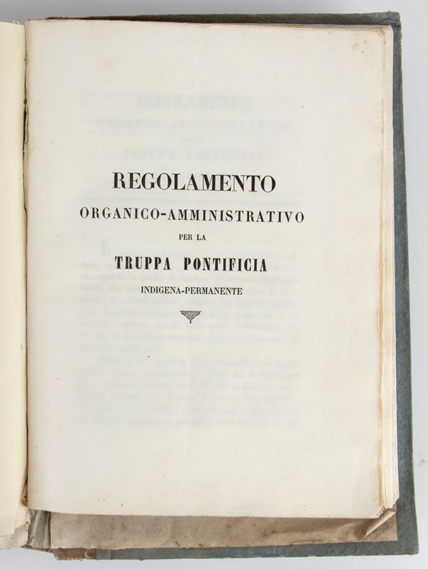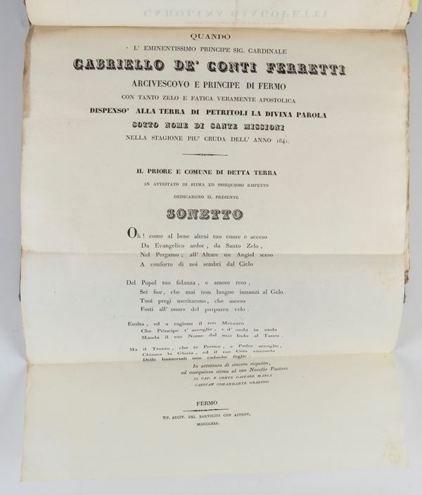 Il materiale è molto vario e comprende cause giuridiche, bandi (tra cui Nuova scoperta d’una vernice per mobili), celebrazioni di messe, fogli della Gazzetta di Foligno, regolamenti delle truppe pontificie. Cartonato editoriale molto consumato, con mancanze di carta al dorso e segni di umidità al piatto anteriore.