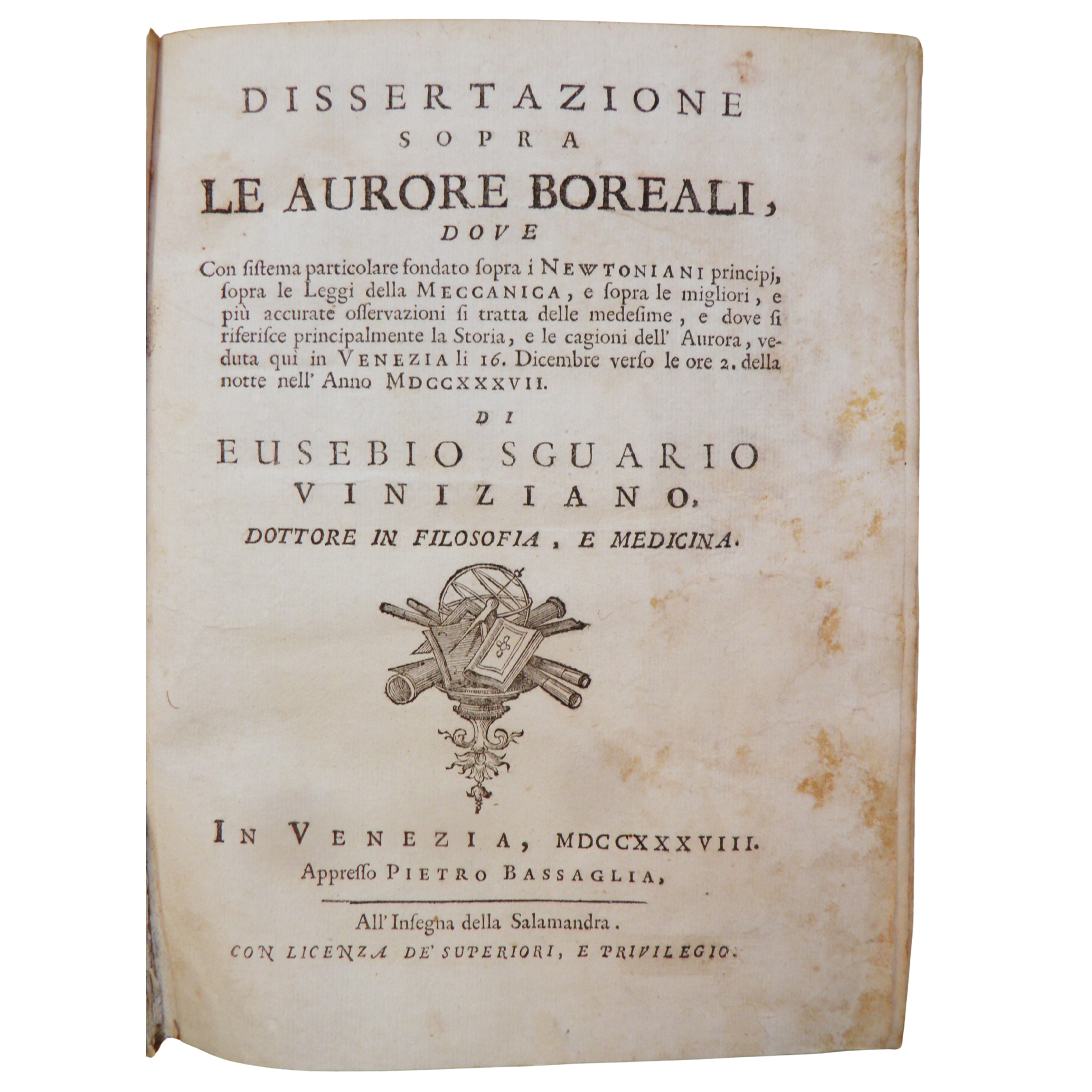 EUSEBIO SGUARIO. Dissertazione sopra le aurore boreali ... di Eusebio Sguario Viniziano Dottore in Filosofia e Medicina, In Venezia, appresso Pietro Bassaglia, 1738