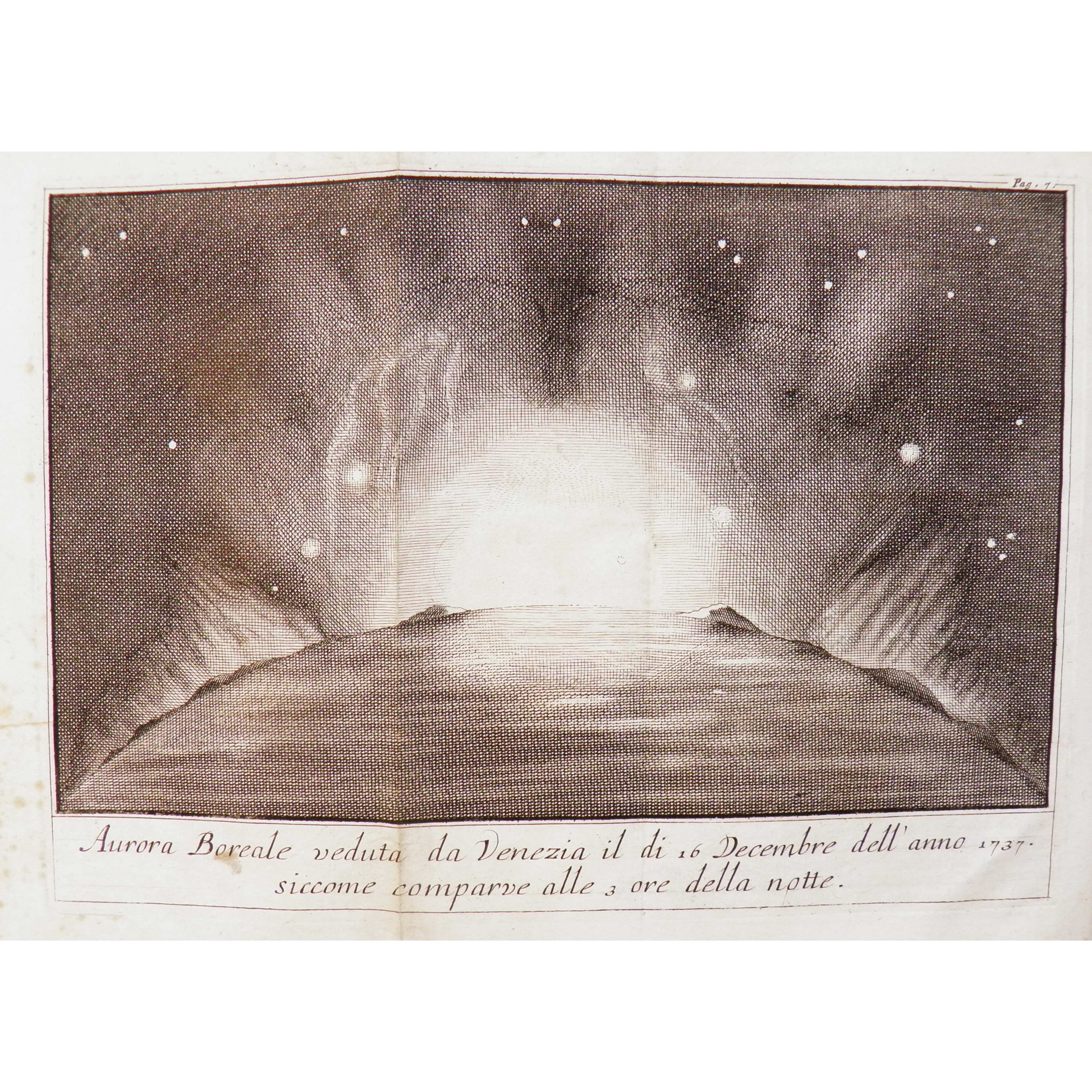 Edizione unica. Sguario era un medico, con l’hobby dello studio della fisica ed è in genere considerato il primo autore italiano a scrivere testi riguardanti l’elettricità. Quest’opera, la prima da lui scritta, fu occasionata dll’aurora boreale osservata in Venezia negli ultimi giorni del 1737, un raro fenomeno a tale latitudine. Negando la possibile correlazione del fenomeno con un tipo di combutione, Sguario lo considera dovuto alla rifrazione dei raggi solari dovuta a corpuscoli presenti nell’atmosfera. Quest’opera fu seguita da una sull’applicazione dell’elettricità alla medicina, una sui terremoti e numerose altre di soggetto puramente medico.
