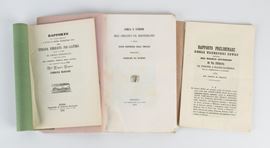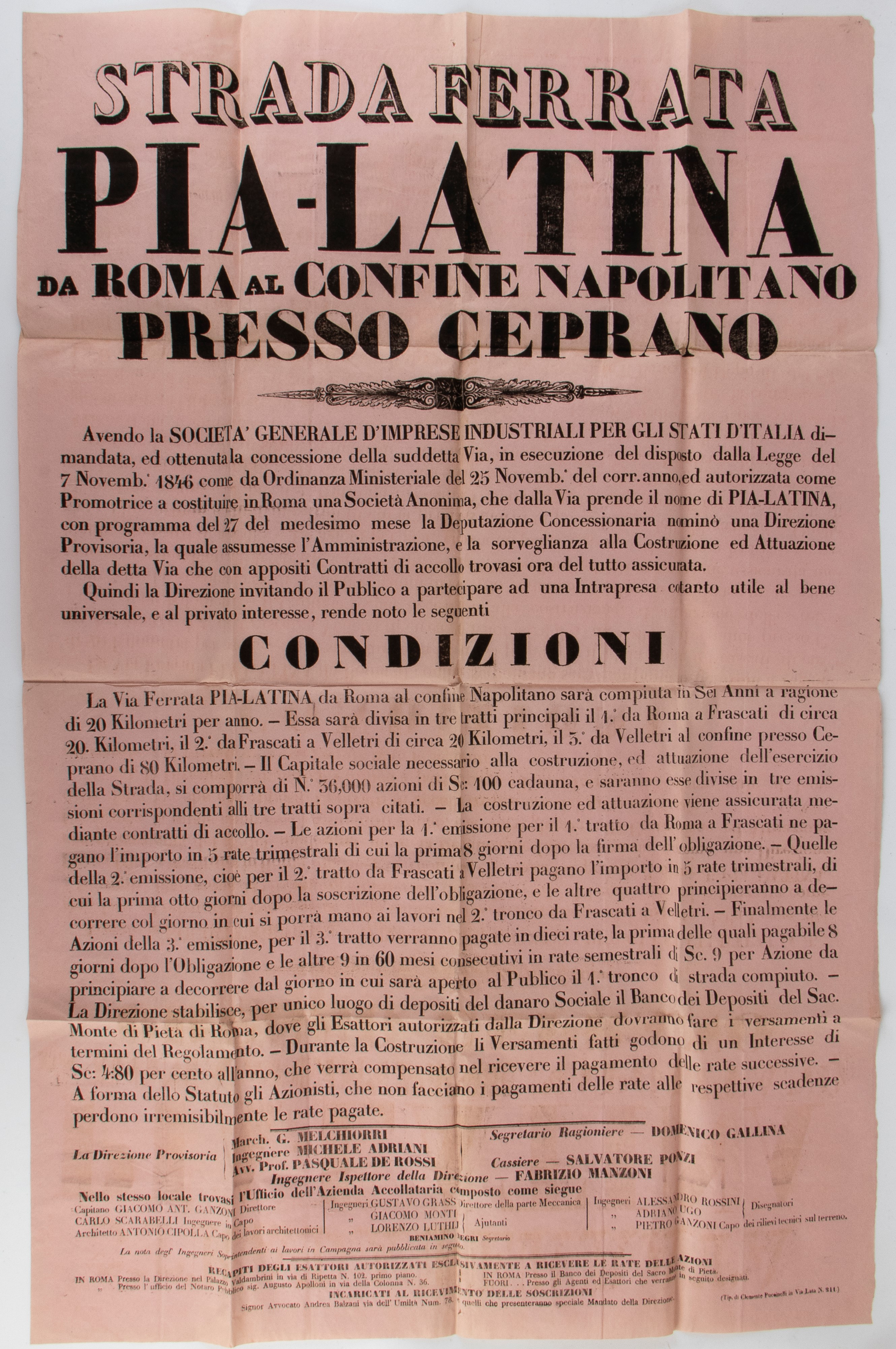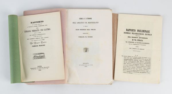 Lotto di 10 brossure originali, quasi tutte in 8°, sullo stato delle ferrovie e delle strade ferrate nella prima metà dell’Ottocento (ca. 1860). Elenchiamo i titoli: Memoria della commissione amministrativa della Provincia di Spoleto sull’utilità e convenienza di preferire ad ogni altra la linea Spoleto, Terni, Castel Raimondo e Narni, per continuare da Foligno alla volta di Roma; Rapporto preliminare degli ulteriori studi eseguiti sul tronco Appennino di via ferrata da Foligno; Strada ferrata da Roma al confine napolitano; Circa l’unione dello Stato Pontificio colla Toscana mediante le strade di ferro; Statuto della Società Pia Latina; Breve cenno sull’ordinamento delle vie ferrate negli Stati Pontifici, 1846; Circa l’unione dell’Adriatico col Mediterraneo e dello Stato Pontificio colla Toscana; Rapporto alla strada ferrata Pia Latina; Società Pia Latina. Programma.