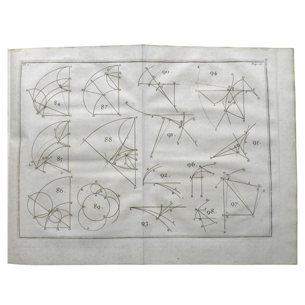 In 4°; XVI, 182 pagine, 11 tavole incise ripiegate; testatine xilografiche. Annotazioni marginali di mano antica alle prime venti pagine; margini destro e inferiore delle pagine 5/6 e 7/8 tagliati e sostituiti (forse per modificare annotazioni preesistenti), con annotazioni della stessa mano. Pelle d’epoca. Leggere brubiture. Esemplare molto buono.