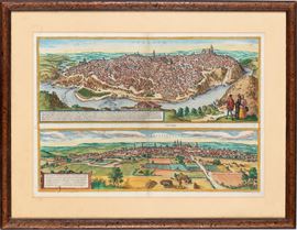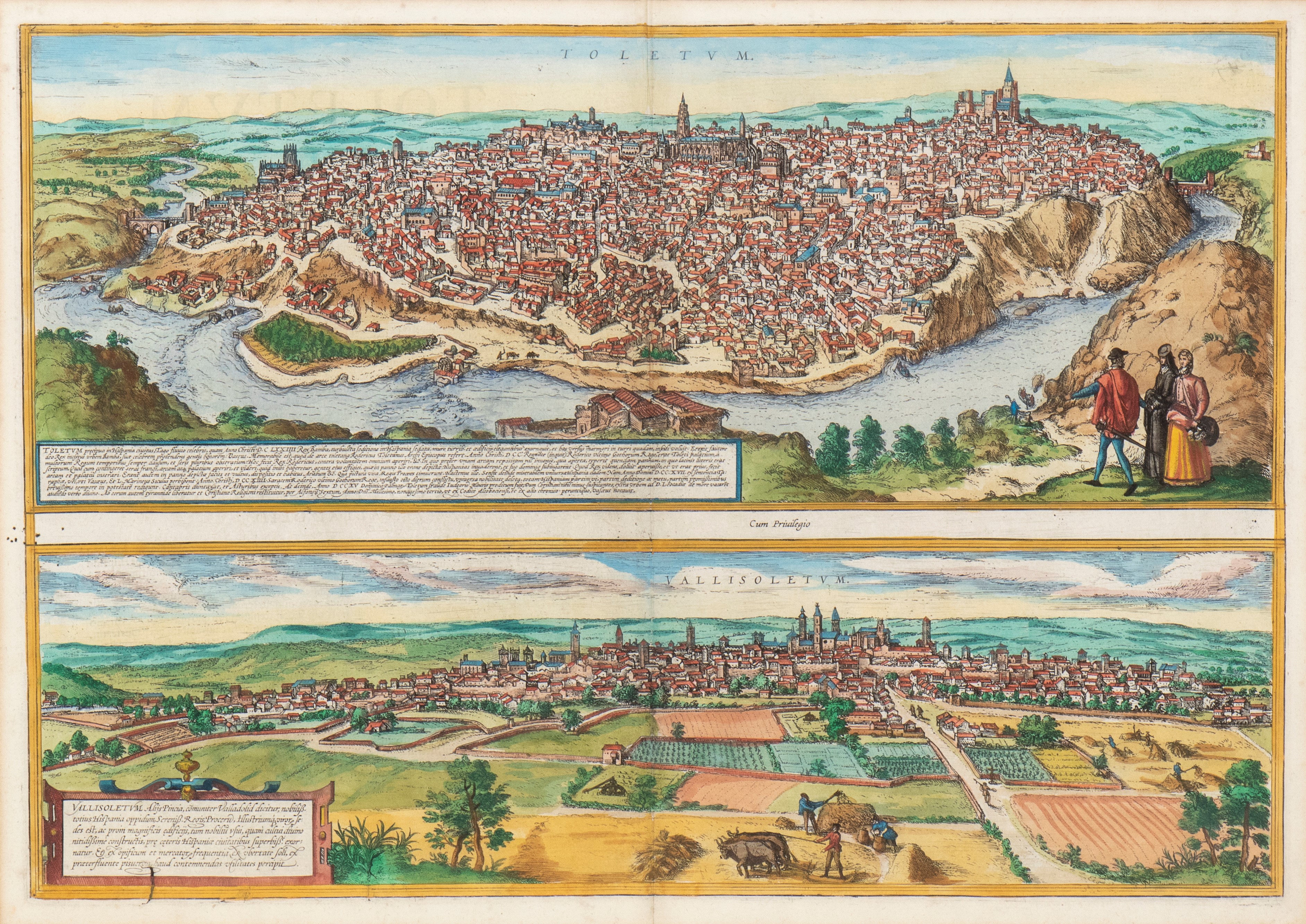 Bulino, 360 x 505 mm ca. (foglio). Doppia veduta di Toledo e Valladoli in Spagna, tratta da "Civitates Orbis Terrarum".