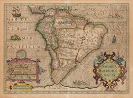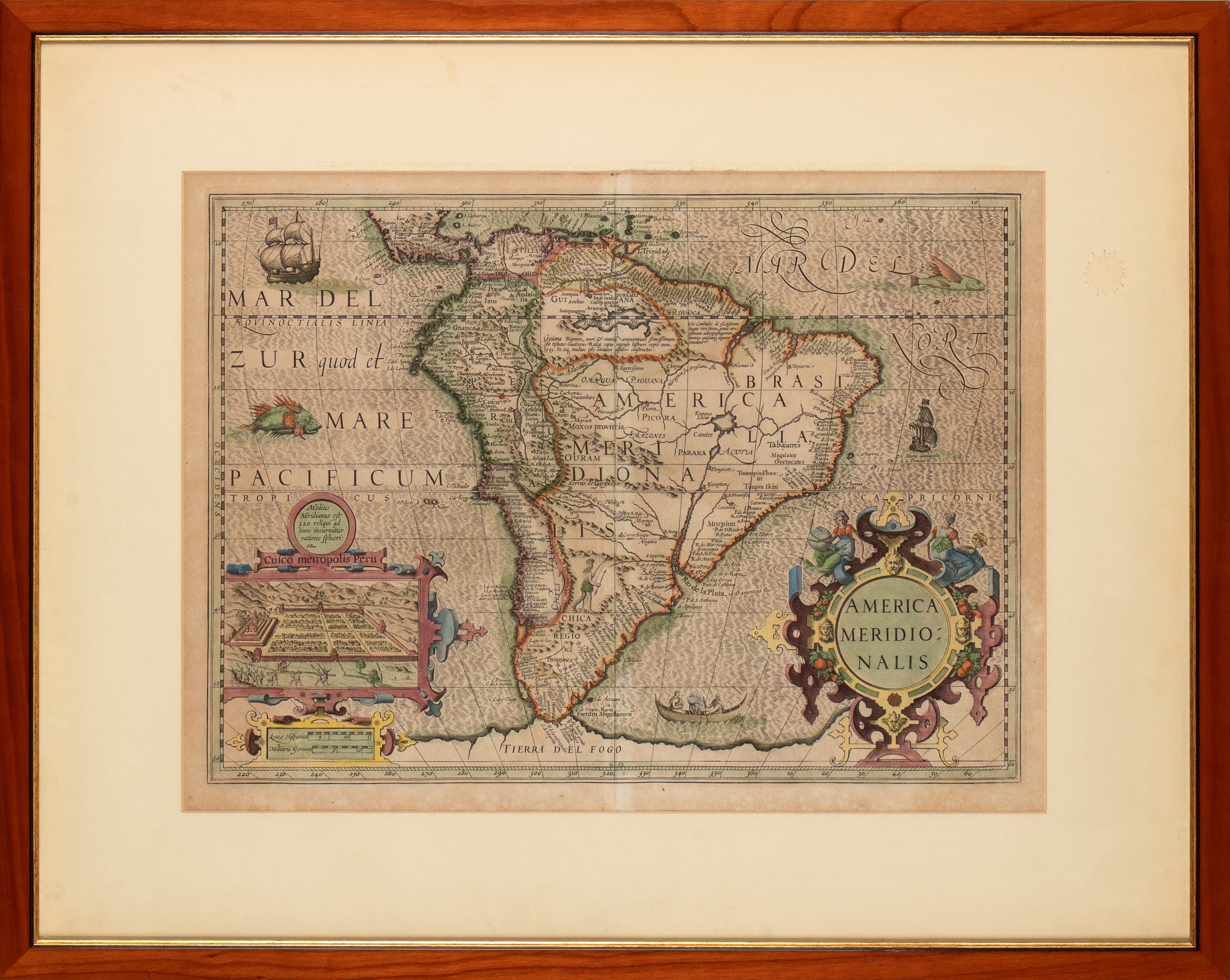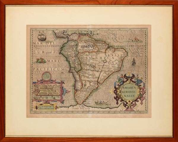Mappa della Sud America. Impressa su carta vergata, colorita a mano. Consueta piega editoriale, uniformi bruniture, ma nel complesso in stato di conservazione molto buono. La stampa non รจ stata esaminata fuori dalla cornice (60 x 75 x 2 cm)
