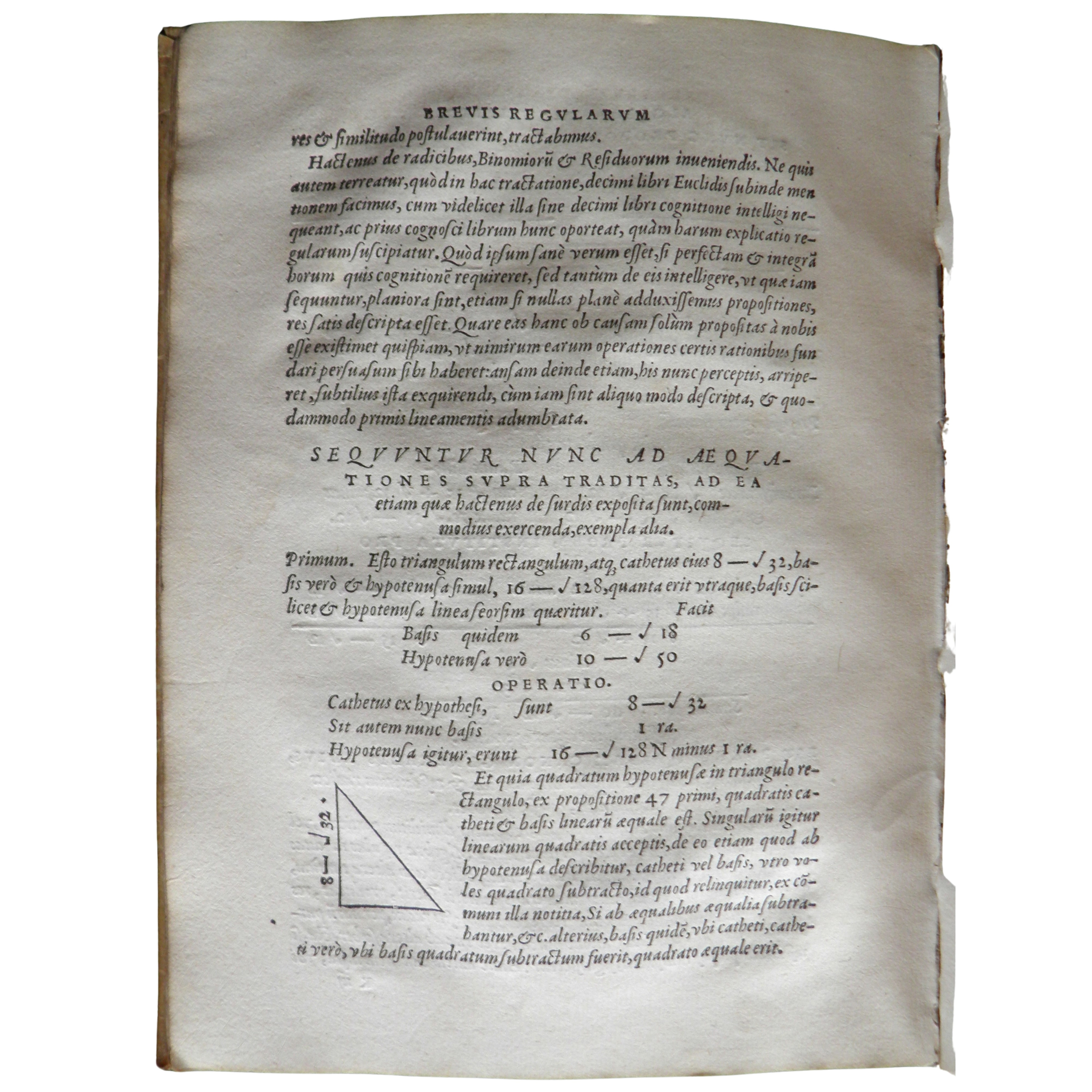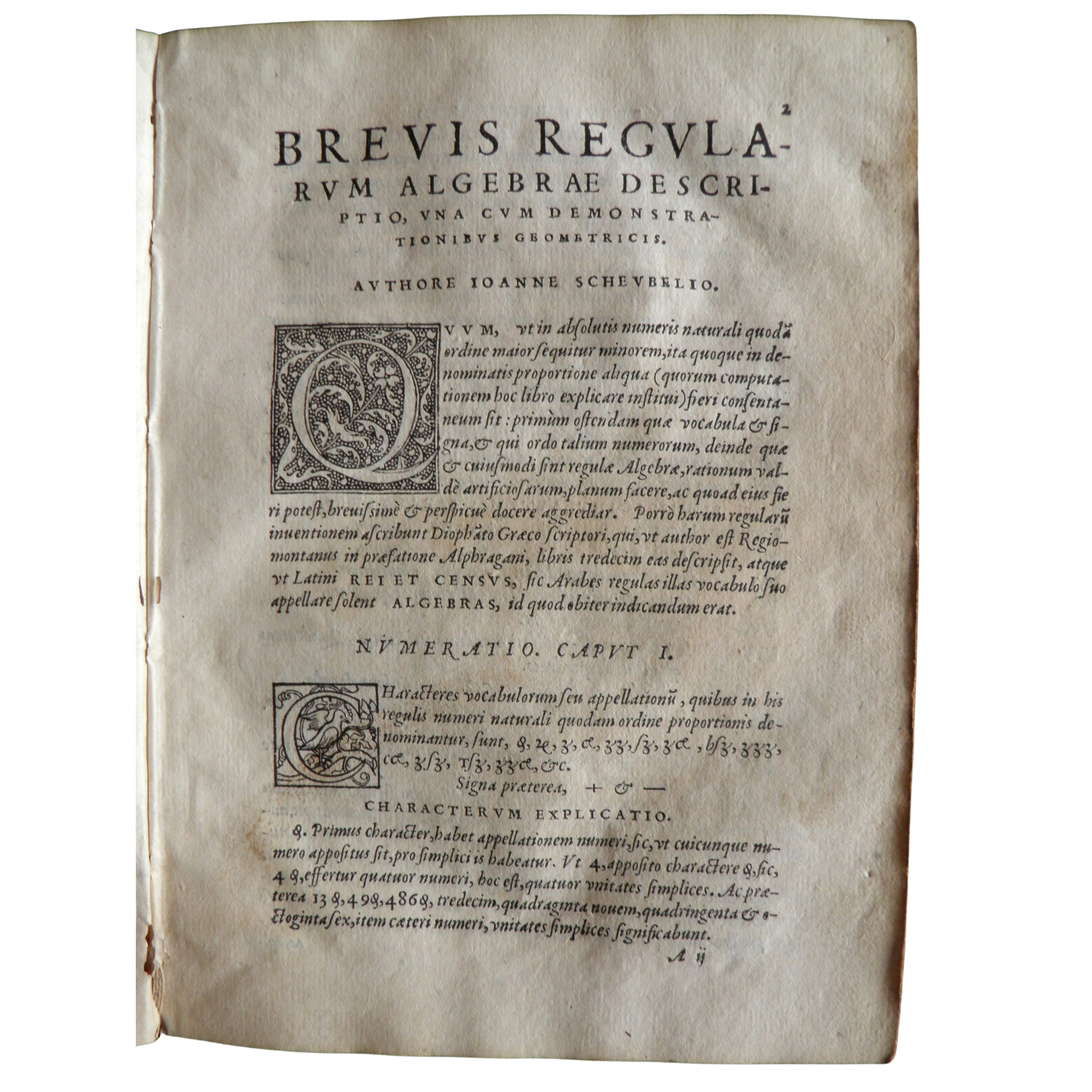 Seconda tiratura dell’unica edizione del primo trattato comprensivo di algebra stampato in Francia. Sviluppando ed approfondendo i concetti matematici precedentemente presentati nel suo commento ai primi sei libri degli Elementi di Euclide, (Basileae, per Ioannem Hervagium, 1550), in questo libro Scheubel introduce in Francia i simboli algebrici della scuola tedesca di Michael Stifel (1486/7 - 1567) e Christoff Rudolff (1499 - 1545), quali “+”, “-“, radici e potenze. Le notazioni e tecniche di Scheubel vennero sistematicamente usate e ulteriormente sviluppate dal più grande matematico del tardo XVI secolo, François Viète (1540 - 1603). Di indisputabile rarità, questo trattato è sempre stato altamente apprezzato sia dagli studiosi che dai collezionisti.