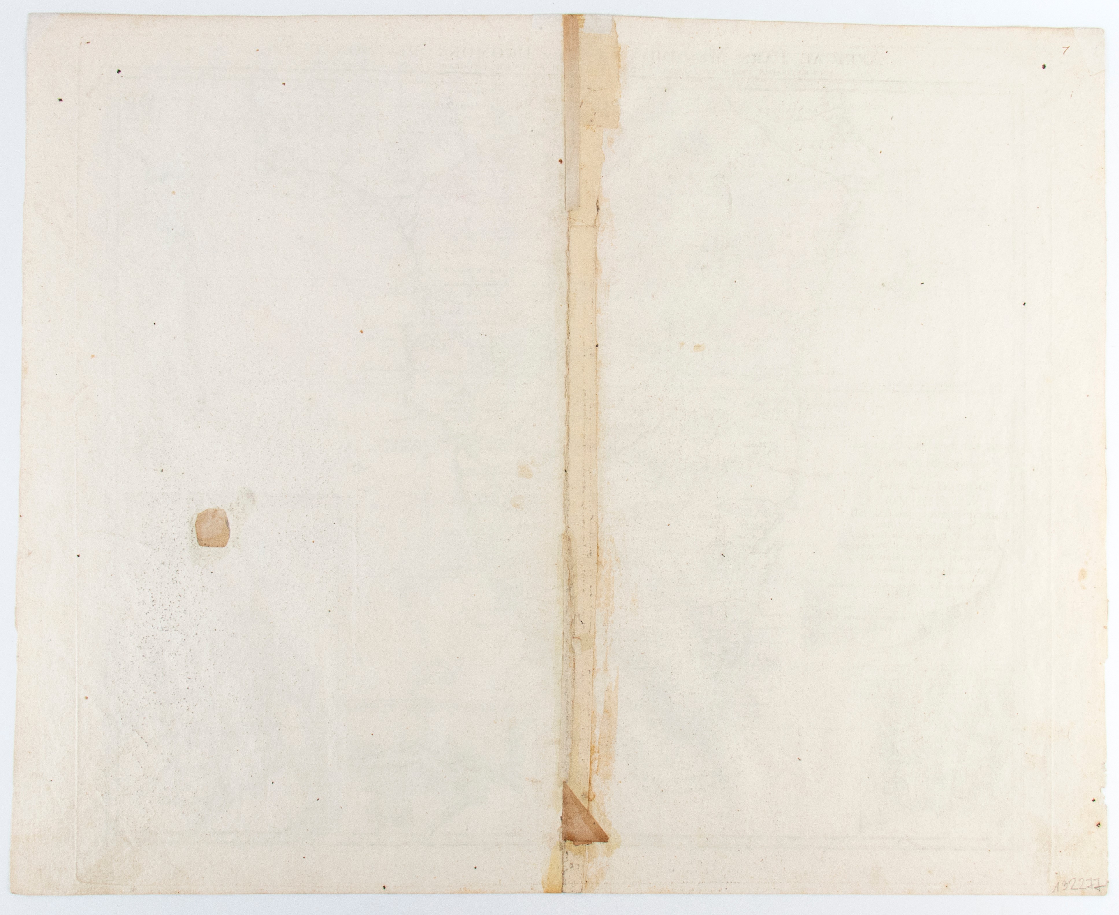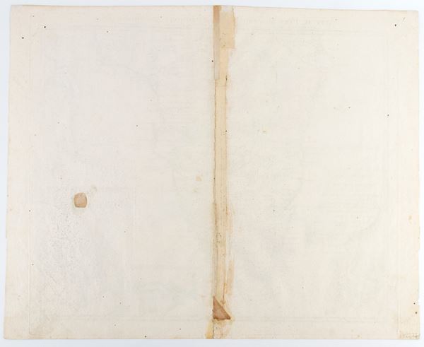 Bella impressione su carta vergata. Parzialmente colorata. Consueta piega editoriale, margini preservati. In buono stato di conservazione salvo una mancanza al centro a destra, restaurata, ed altri due restauri vicino la piega.