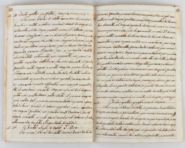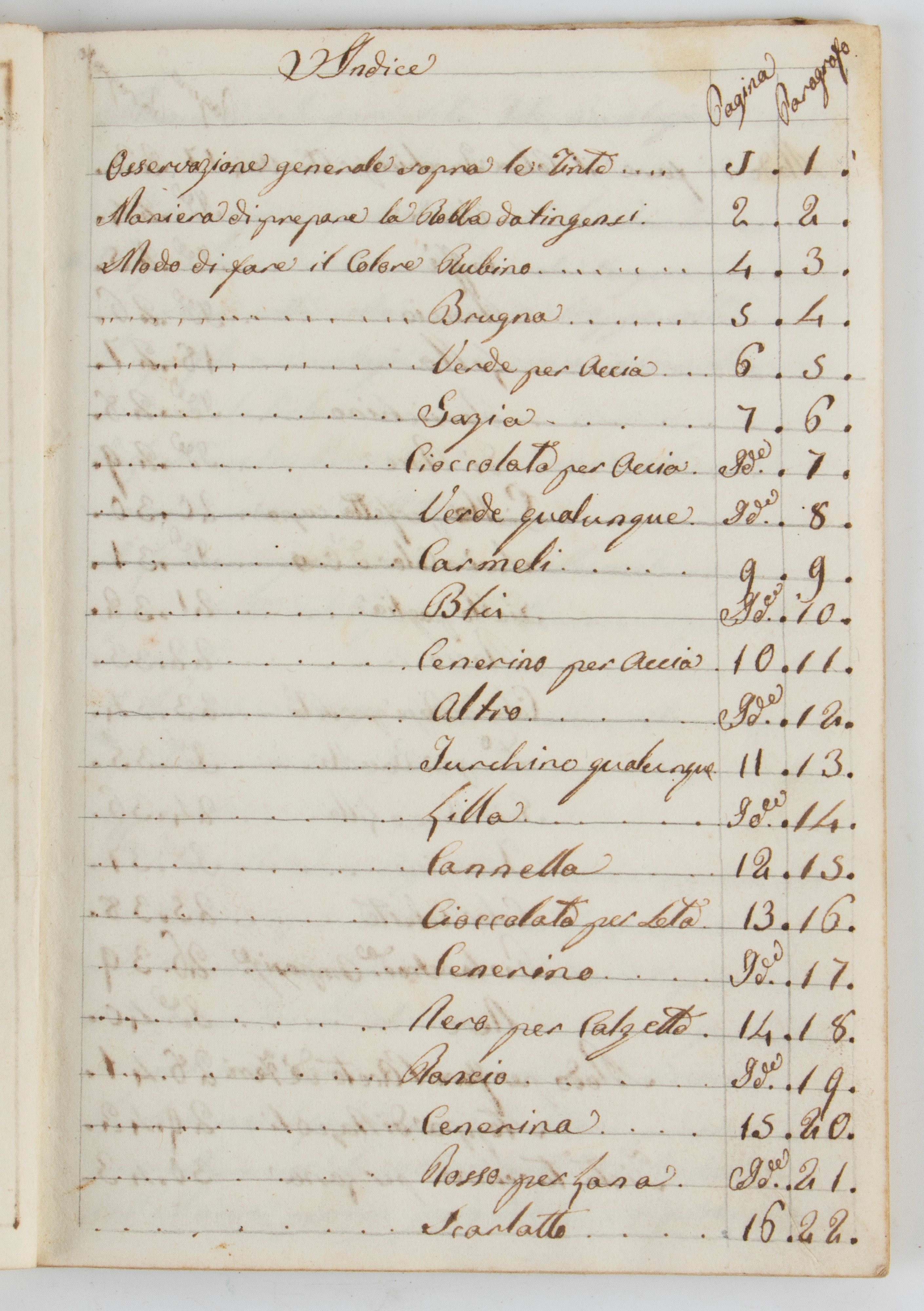 Manoscritto in 8° di 31 fogli con le Istruzioni per tingere in diversi colori. Il documento si presenta privo di legatura. Il volume si apre con un indice delle tinte: Rubino, Prugna, Verde, Carmeli, Lilla, Scarlatto.