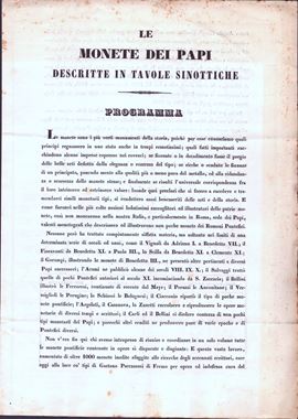 Lettera manoscritta, datata Fermo, 16 febbraio 1848, a firma di Angelo Cinagli, autore del volume a stampa Le monete dei papi, rivolta al signor Michele Adriani a Roma, al quale viene inviato un quaderno a stampa, programma della prossima pubblicazione Delle monete dei papi descritte in tavole sinottiche.
