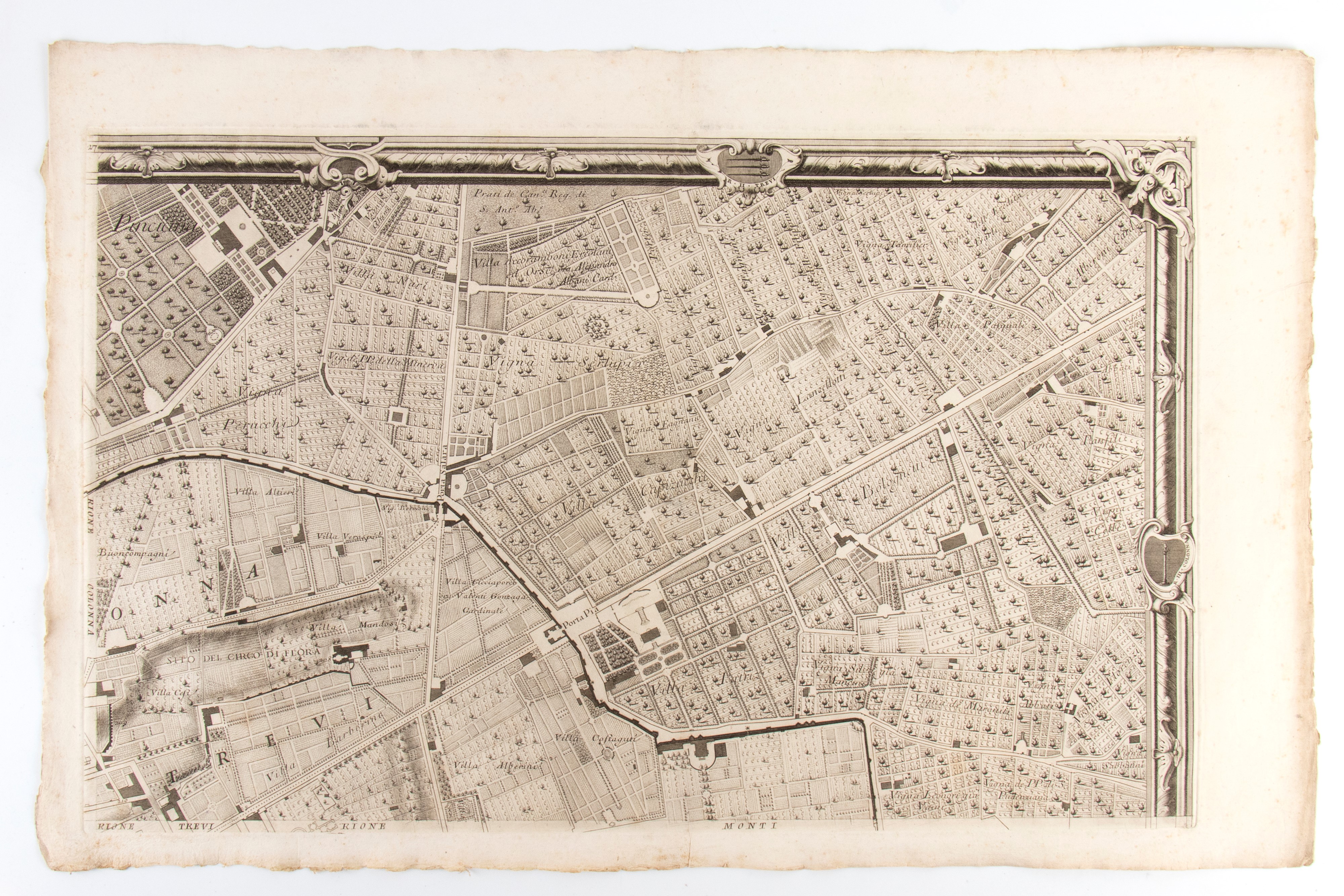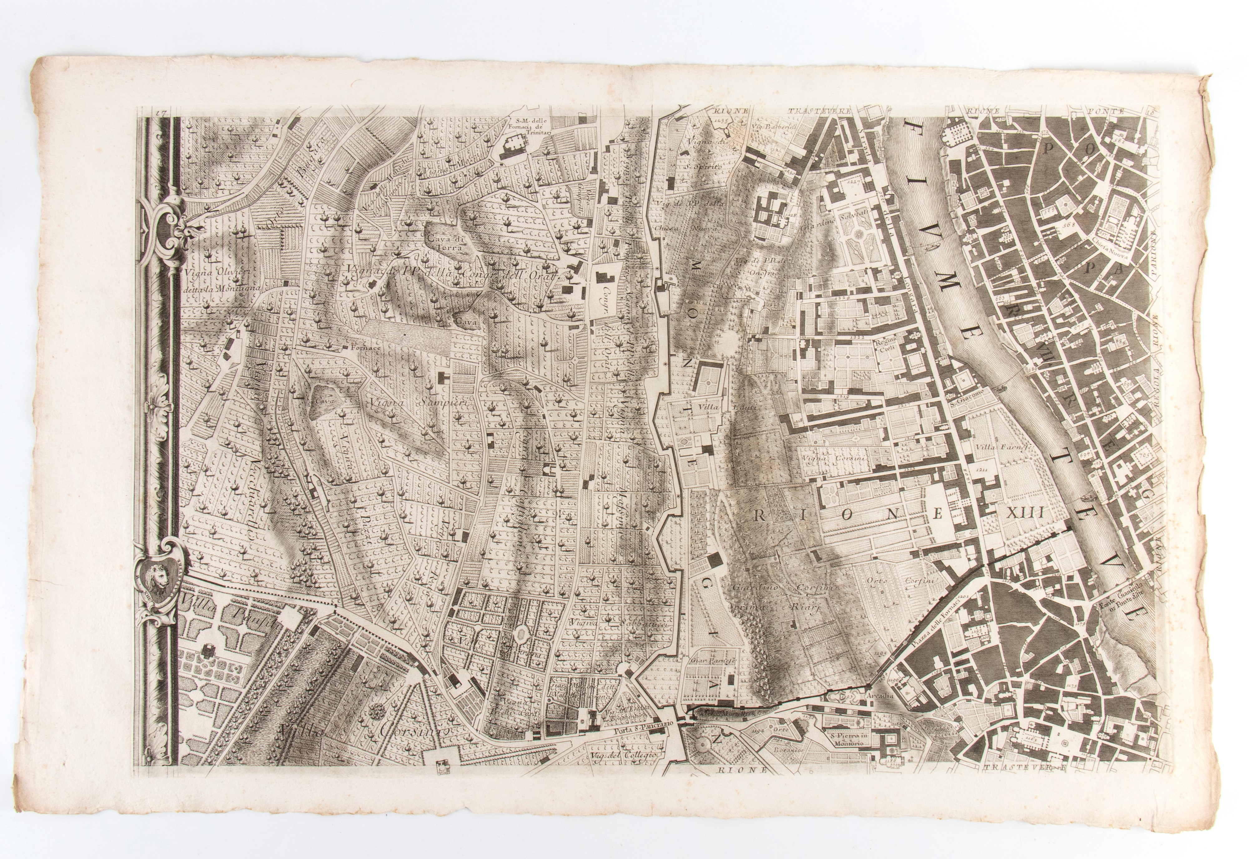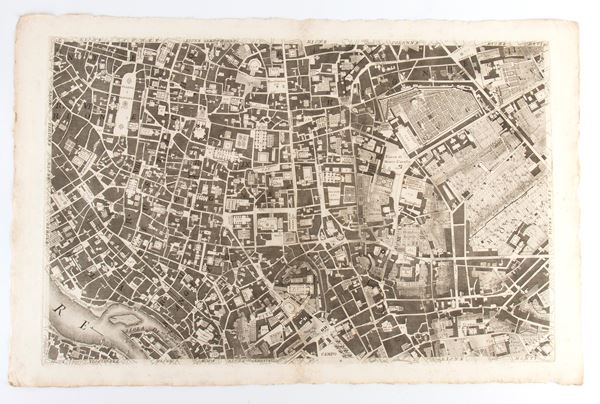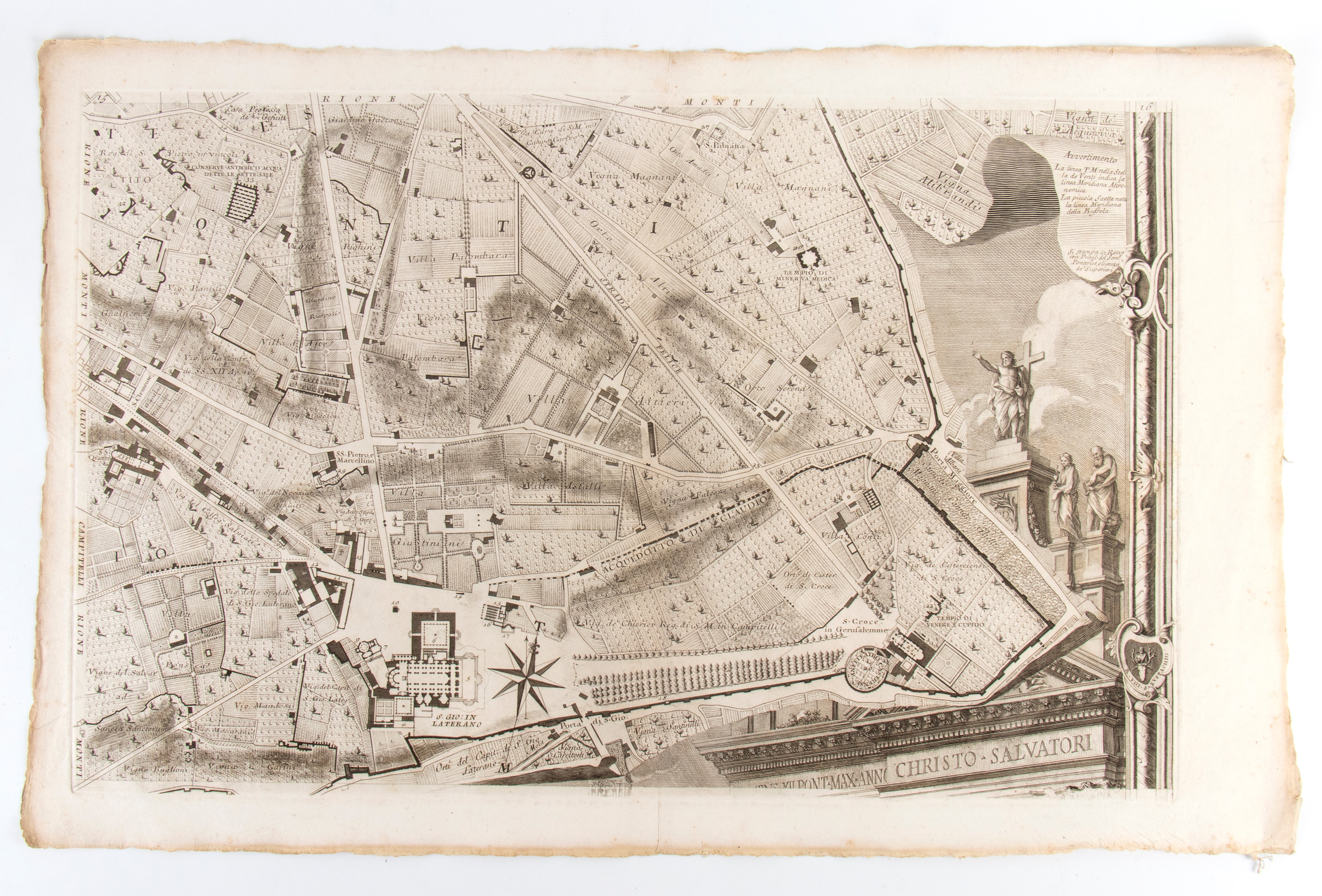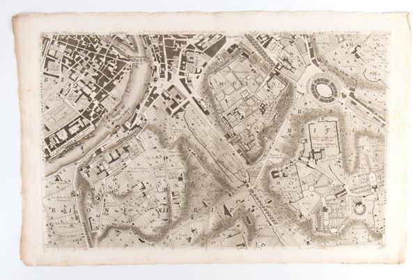 In folio grande. Opera incompleta: 9 (di 12) tavole della grande mappa di Roma, 4 tavole con l’indice, il frontespizio e l’avviso al lettore, e la riduzione della mappa La Topografia di Roma (9+4+1+1).