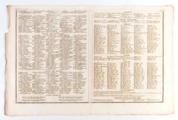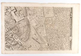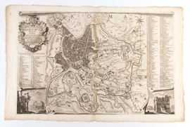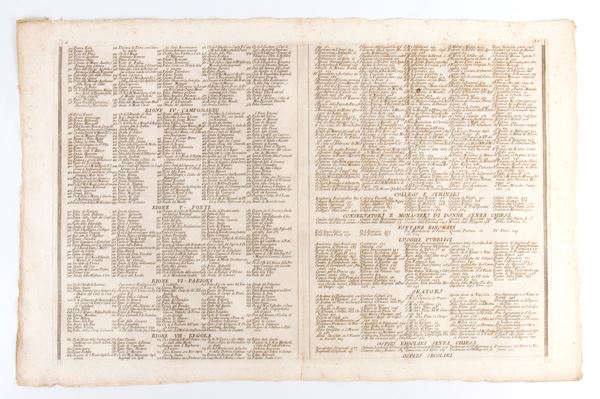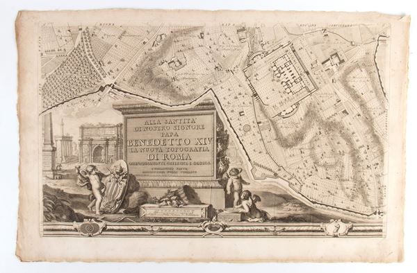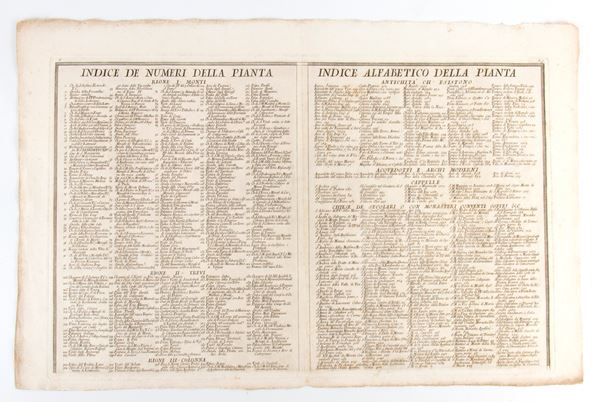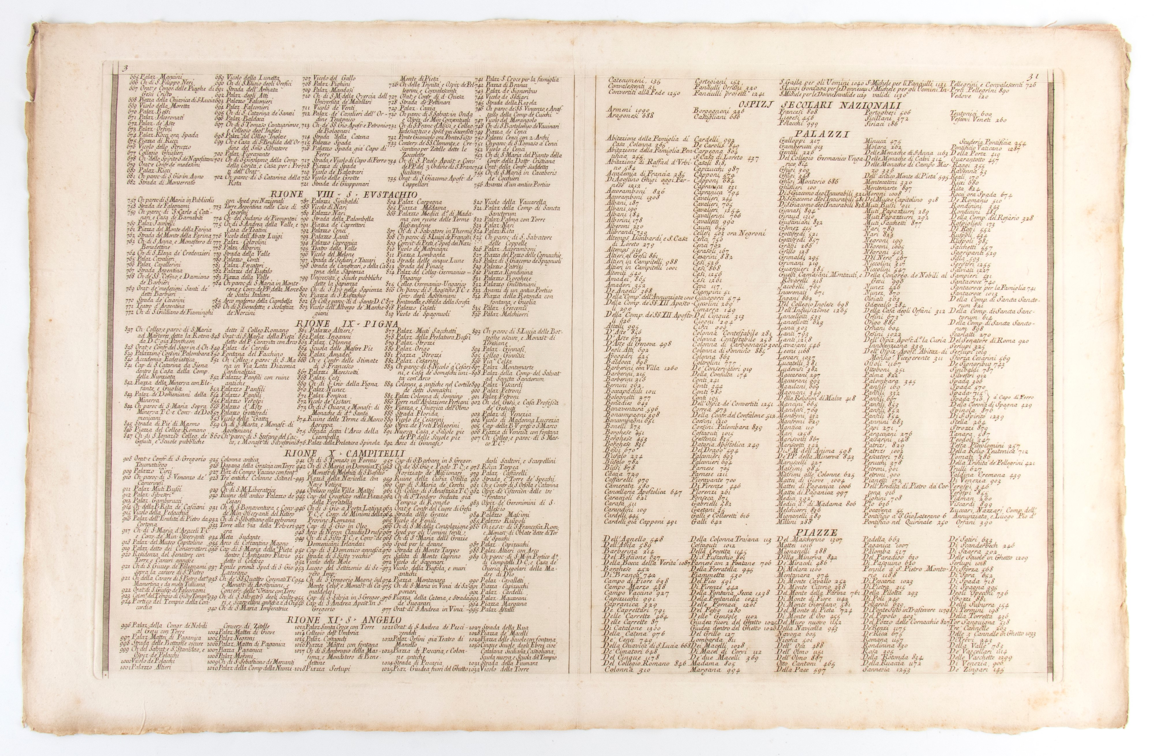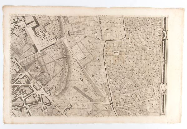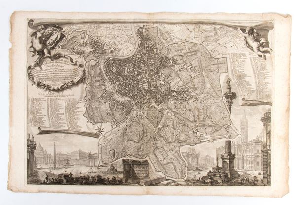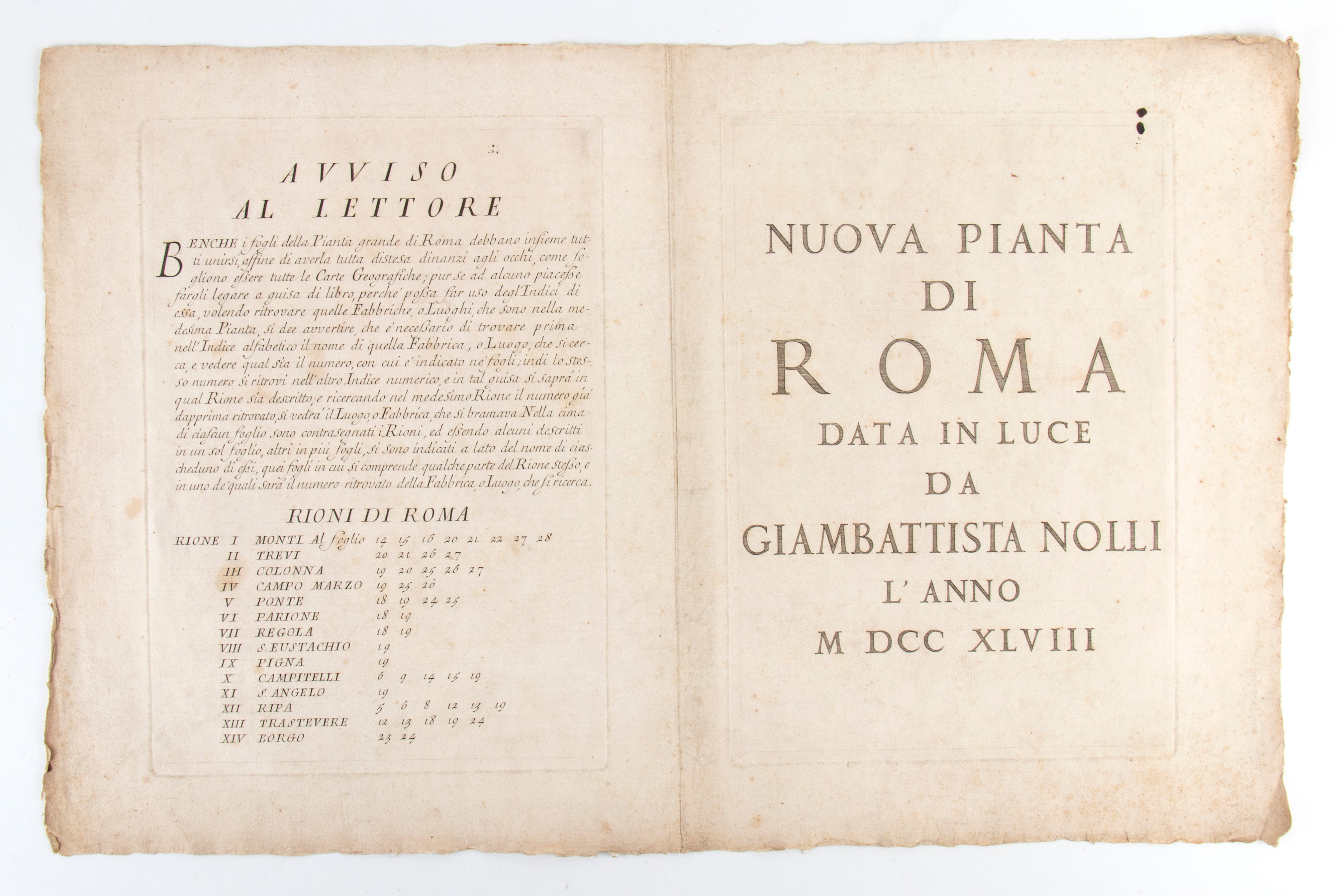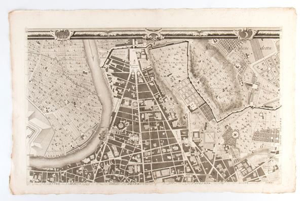 In folio grande. Opera incompleta: 9 (di 12) tavole della grande mappa di Roma, 4 tavole con l’indice, il frontespizio e l’avviso al lettore, e la riduzione della mappa La Topografia di Roma (9+4+1+1).