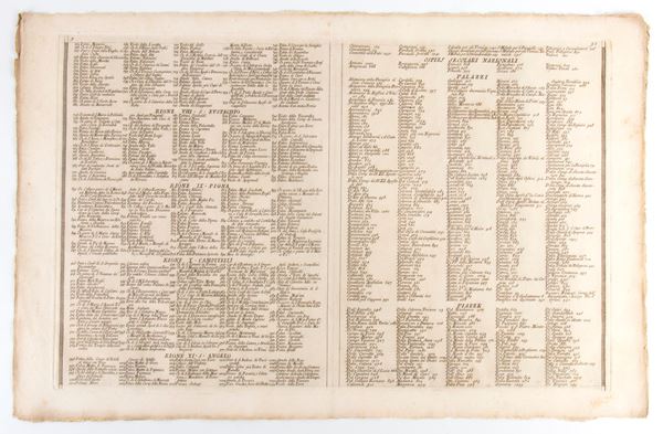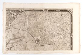 15 fogli di 18 dell’opera originale, ancora da unire. Acquaforte e bulino, 500 × 865 mm cad. Stampate su carta vergata con filigrana (giglio nel cerchio). Margini preservati, consuete pieghe editoriali centrali. Segni di fioritura, alcune bruniture lungo i bordi e qualche altro difetto minore, ma nel complesso in ottimo stato di conservazione.