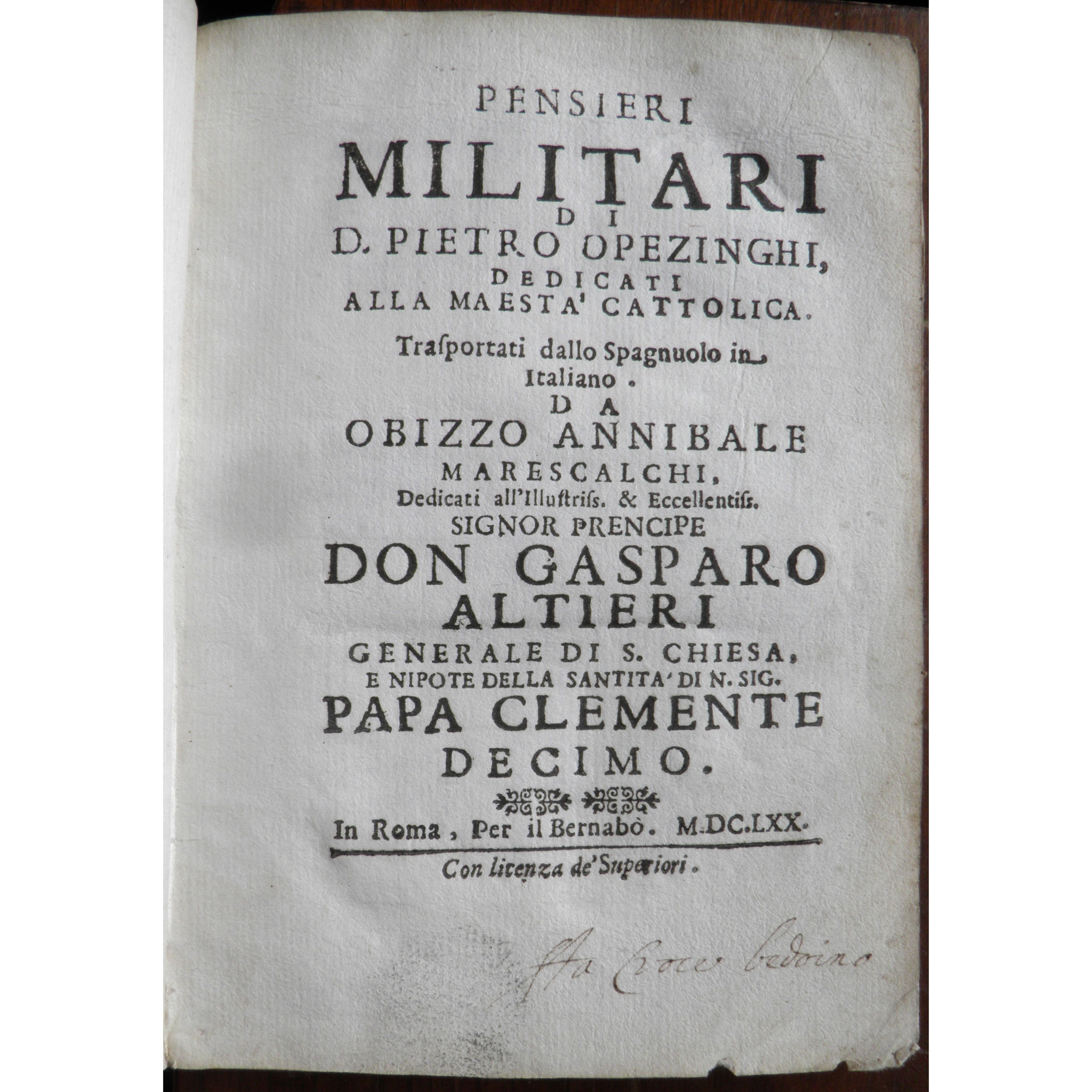 Pietro degli OPIZINGHI TAGLIAVIA. Pensieri militari di D. Pietro Opezinghi, dedicati alla Maestà Cattolica. Trasportati dallo Spagnolo in Italiano da Obizzo Annibale Marescalchi, dedicati all’Illustriss. & Eccellentiss. Signor Prencipe Don Gasparo Altieri Generale di S. Chiesa, e nipote della Santità di N. Signore Papa Clemente Decimo, Roma, per il Bernabò, 1670