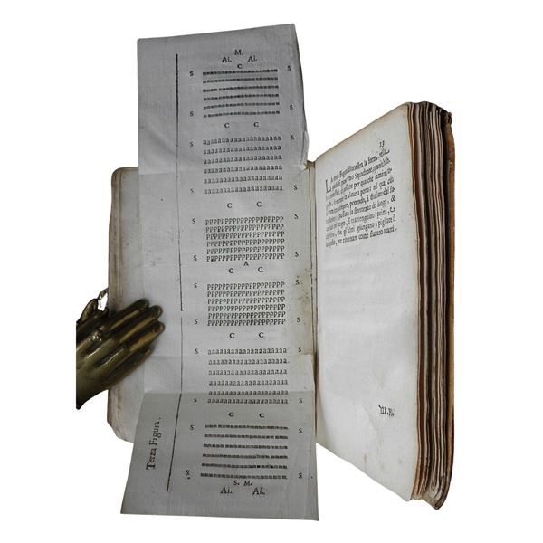 In 8°; [24], 43, [1] pagine, [4] tavole ripiegate (in forma di strisce, rappresentanti le formazioni delle truppe). Segnatura a-c4, A-E4, F2 (carta a1 bianca). Ritratto inciso del traduttore - Obizzo Annibale Marescalchi, membro della nobiltà militare bologneseof the Bolognese military nobility - e dell’autore alle carte b3v e b4r, rispettivamente. Pergamena floscia originale.