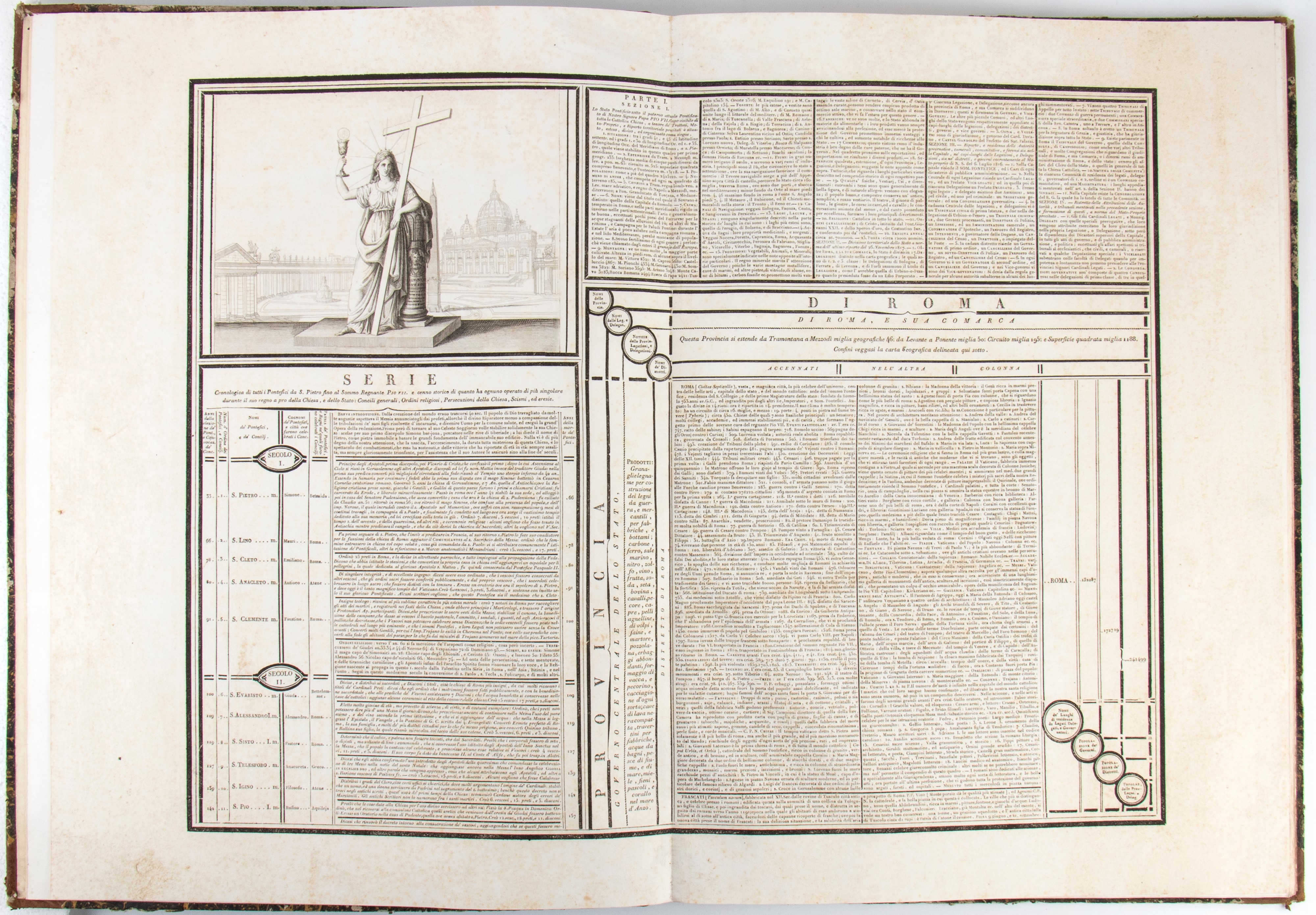 Prospetto del quadro generale dello Stato Pontificio annunciato dall’autore Luigi Antonio Senes Trestur di Antibo con manifesto del 25 settembre 1821 in Roma ridotto e delineato ad 1 trentaseiseimo circa del vero che si da gratuitamente ai signori associati per servire loro di norma nella distribuzione e riunione dei fogli dell’opera. Dedica aua Eccellenza il Duca di Blacas d’Aulps, 1822.