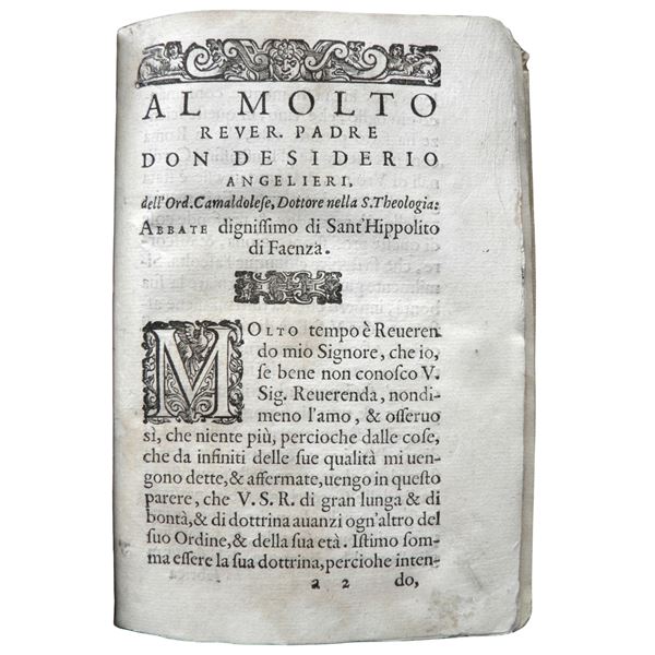 In 8° (150x105); [16], 160 carte. Segnatura: a-b1-8, A-V1-8. Marca editoriale xilografica al frontespizio, testatine e capilettera xilografici. Pergamena d’epoca. Due quinterni allentati, leggera macchia all’angolo inferiore interno di alcune pagine. Antiche annotazioni a un piccolo timbro al frontespizio. Buon esemplare.