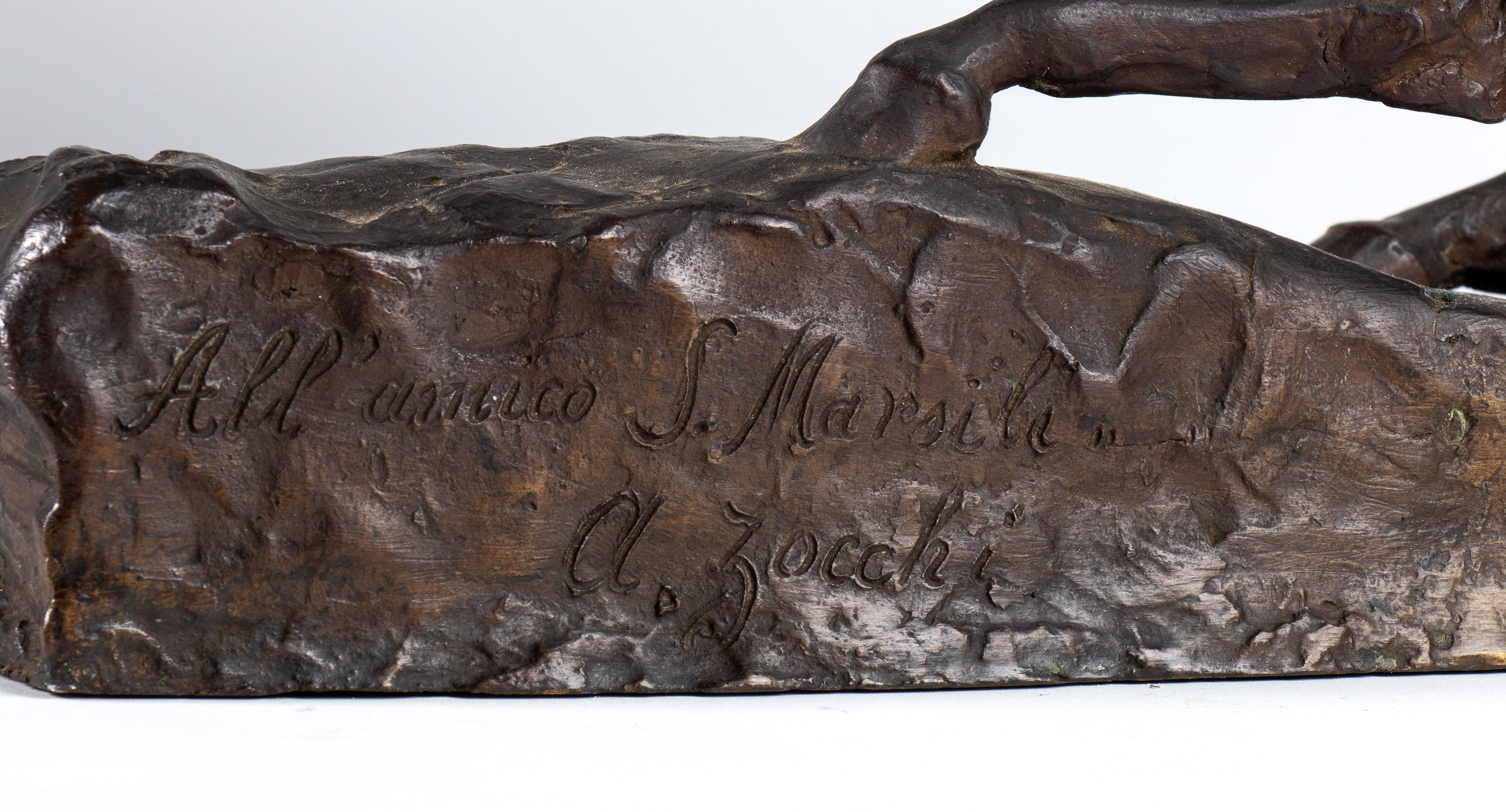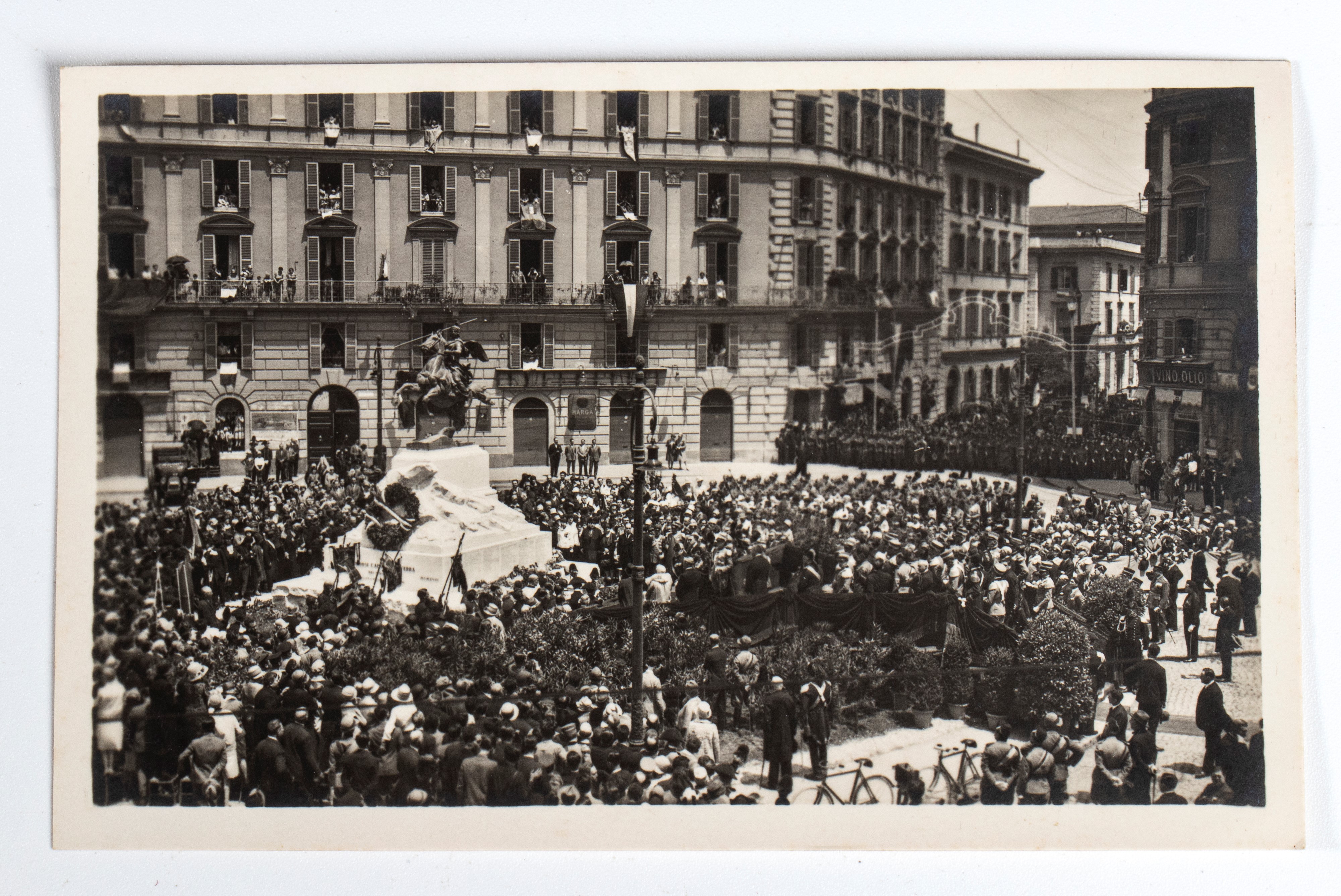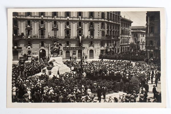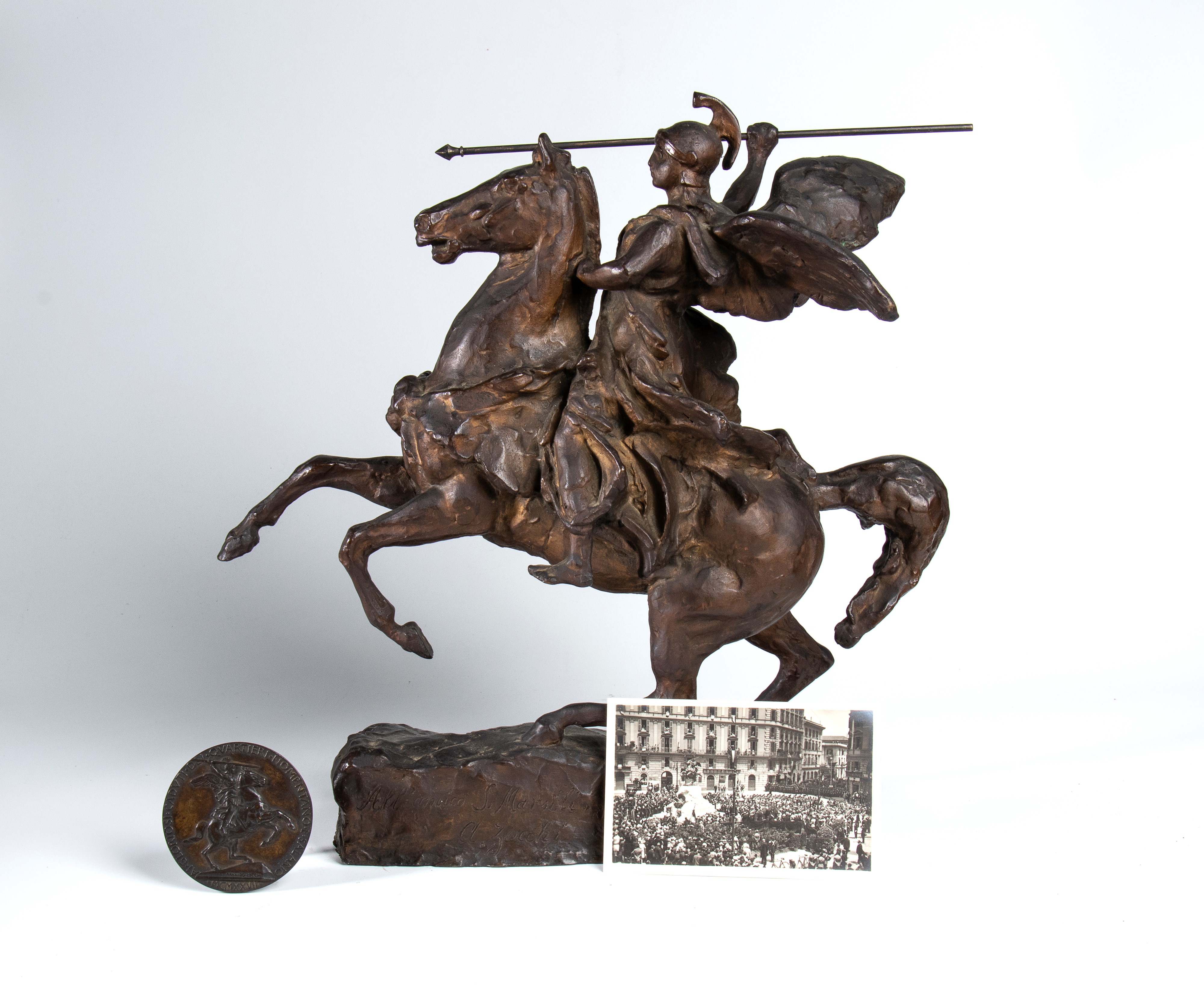 Bellissima fusione in bronzo dell'allegoria della vittoria alata a cavallo, opera dello scultore Arnaldo Zocchi. Sul basamento dove poggia il cavallo รจ presente una iscrizione: "All'amico S. Marsili, A Zocchi". Si tratta della statua monumento ai caduti ora posizionata nell'ingresso su Via Nomentana di Villa Paganini a Roma. Il monumento fu inaugurato nel 1929 alla presenza dei sovrani ed era inizialmente collocato in Piazza della Regina, per poi essere spostato nel 1938 nella collocazione attuale. Fanno parte del lotto una fotografia del monumento stesso in Piazza della Regina e la medaglia statica in bronzo commemorativa dell'inaugurazione.