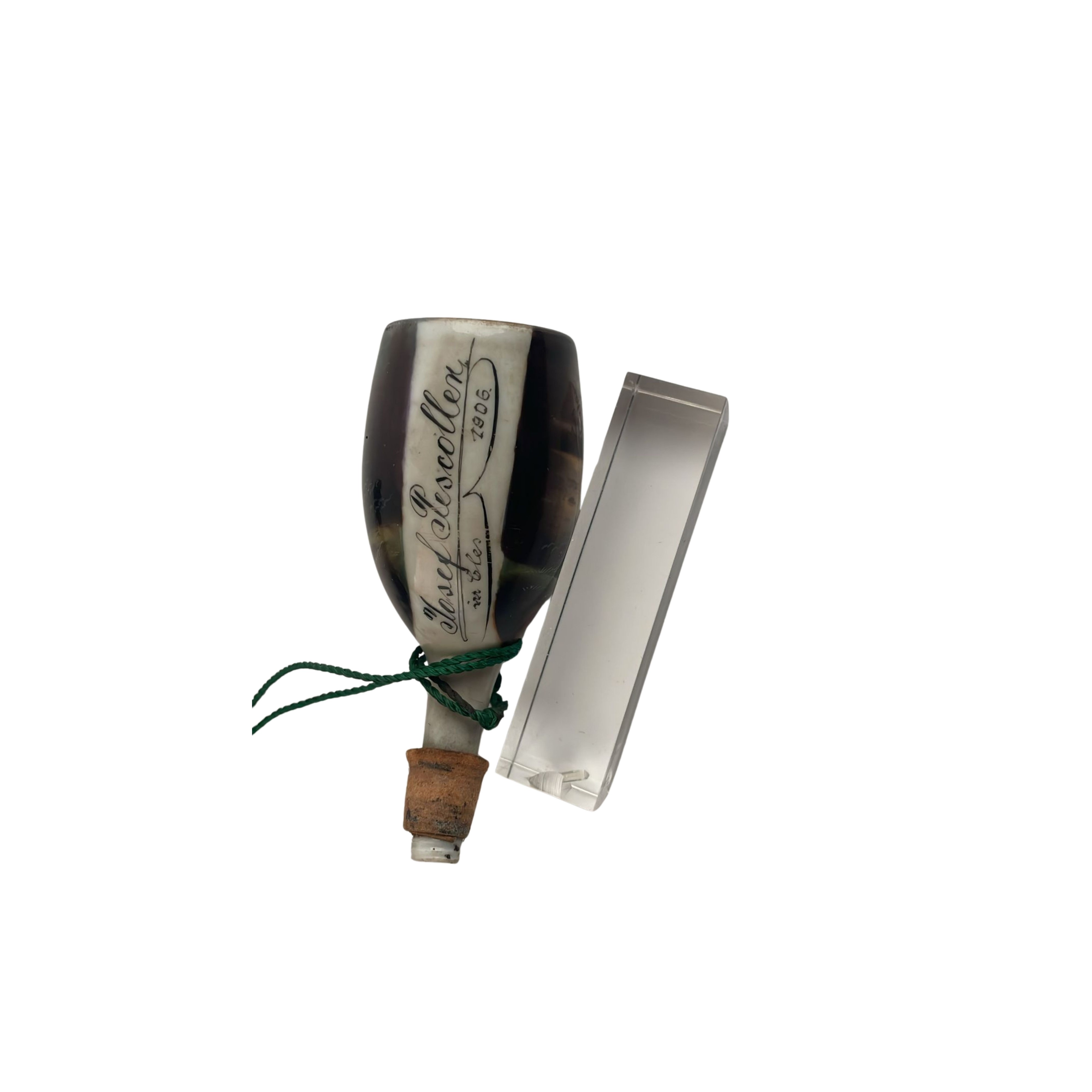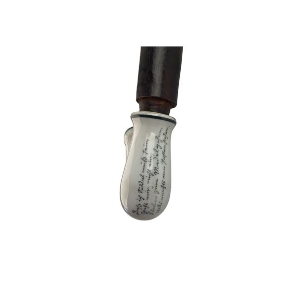 Pipa in ceramica decorata con scene galanti. Sul fornello รจ indicato il nome del congedante, Joseph Pescoller. In Coles, anno 1906