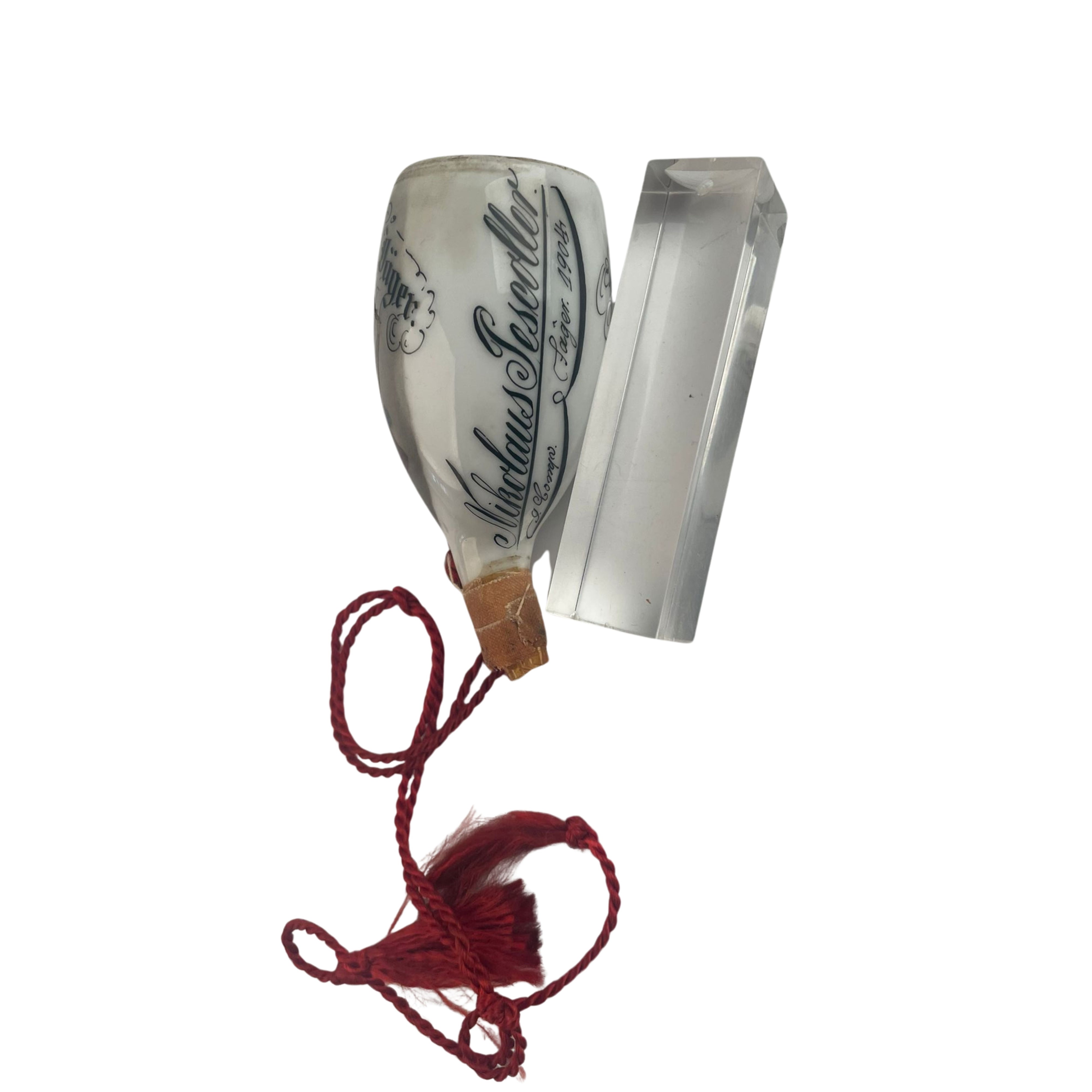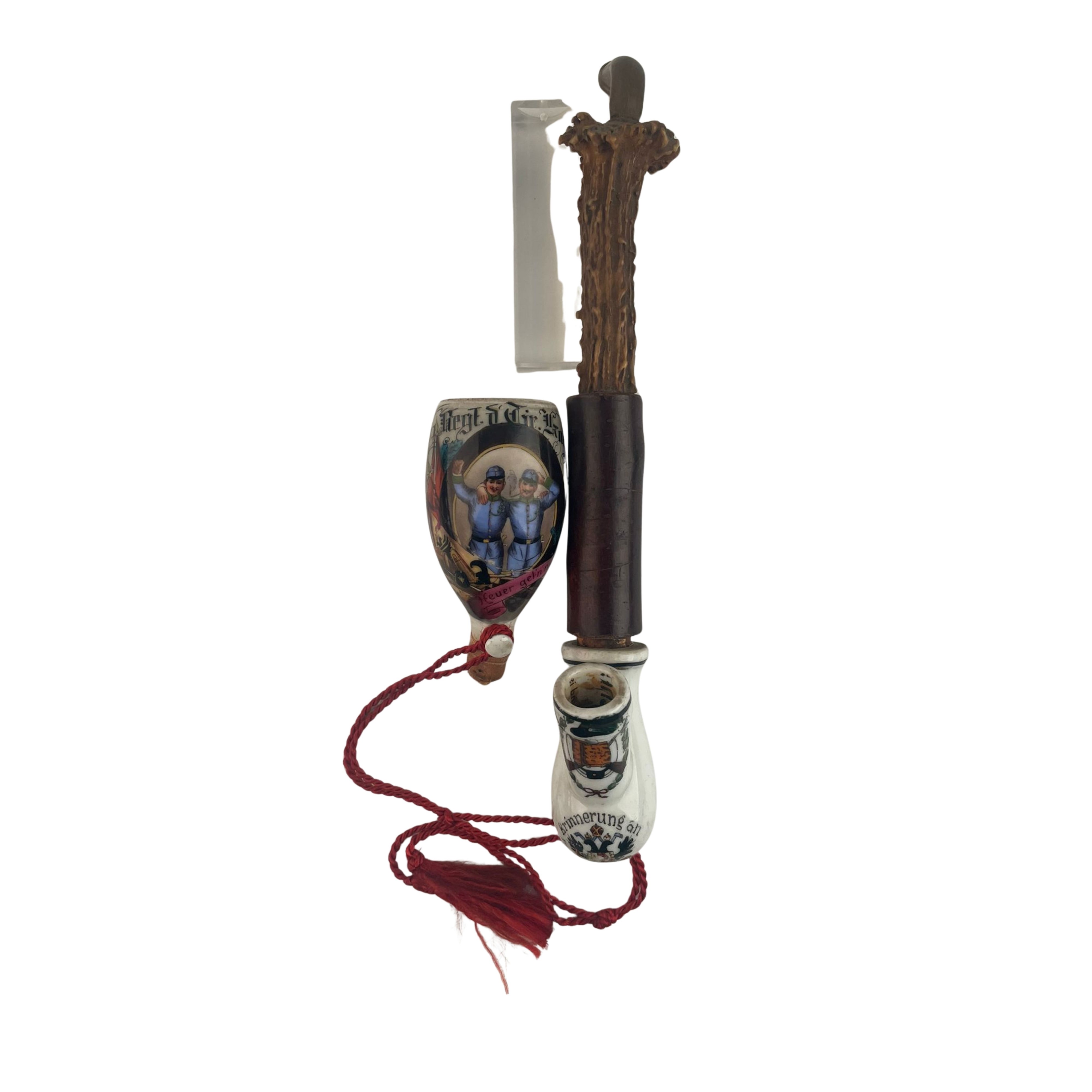 Pipa in porcellana, corno e legno. Sul corpo principale una scena di cameratismo tra commilitoni con sovrastante il nome del reggimento. La pipa porta il nome di Nikolaus Pescoller, della nona compagnia Jager. La pipa presenta rotture e restauri mal eseguiti