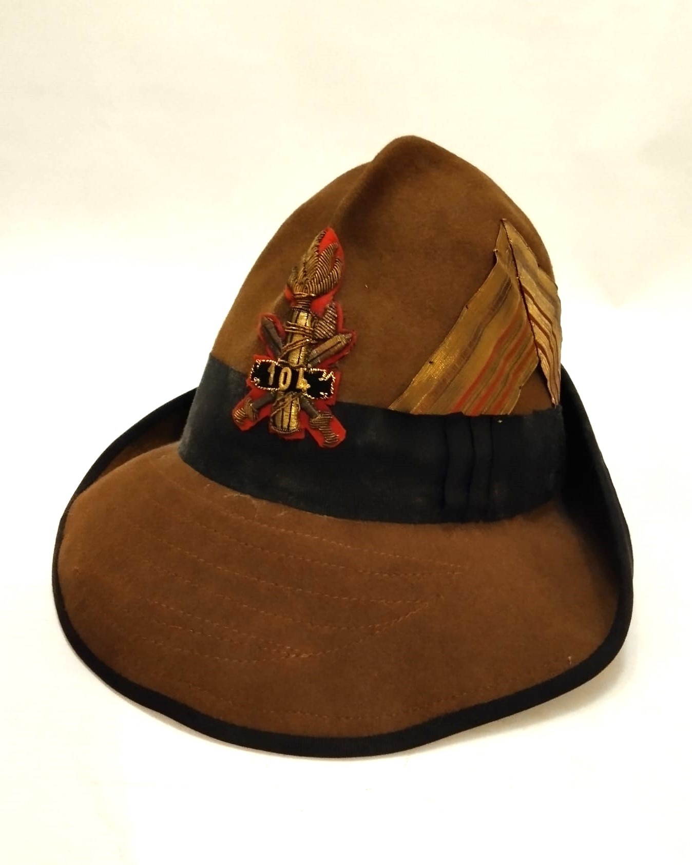 Bellissimo cappello all'alpina da Console comandante Legione di CCNN in Africa. Feltro marrone bordato di nastro in seta nera, bel fregio ricamato di canottiglia dorata su fondo robbio col numero della Legione nella targhetta centrale. Interno in seta bianca con marchi del fabbricante. In ottimo stato. Molto raro.