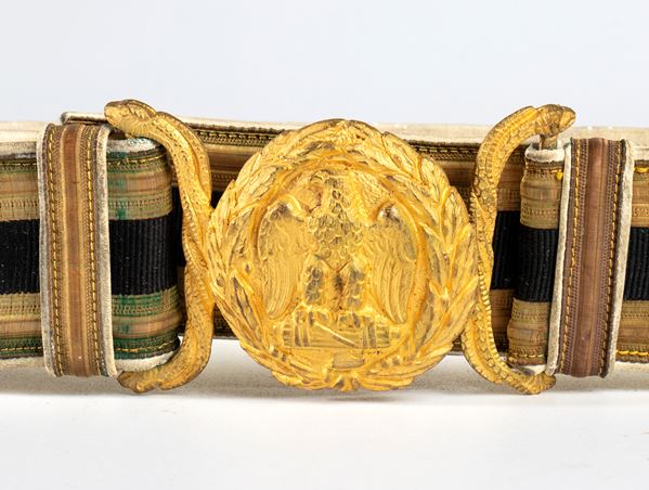 Cintura per alta uniforme in broccato foderato di marocchino con fibbia in bronzo dorato. In ottimo stato.