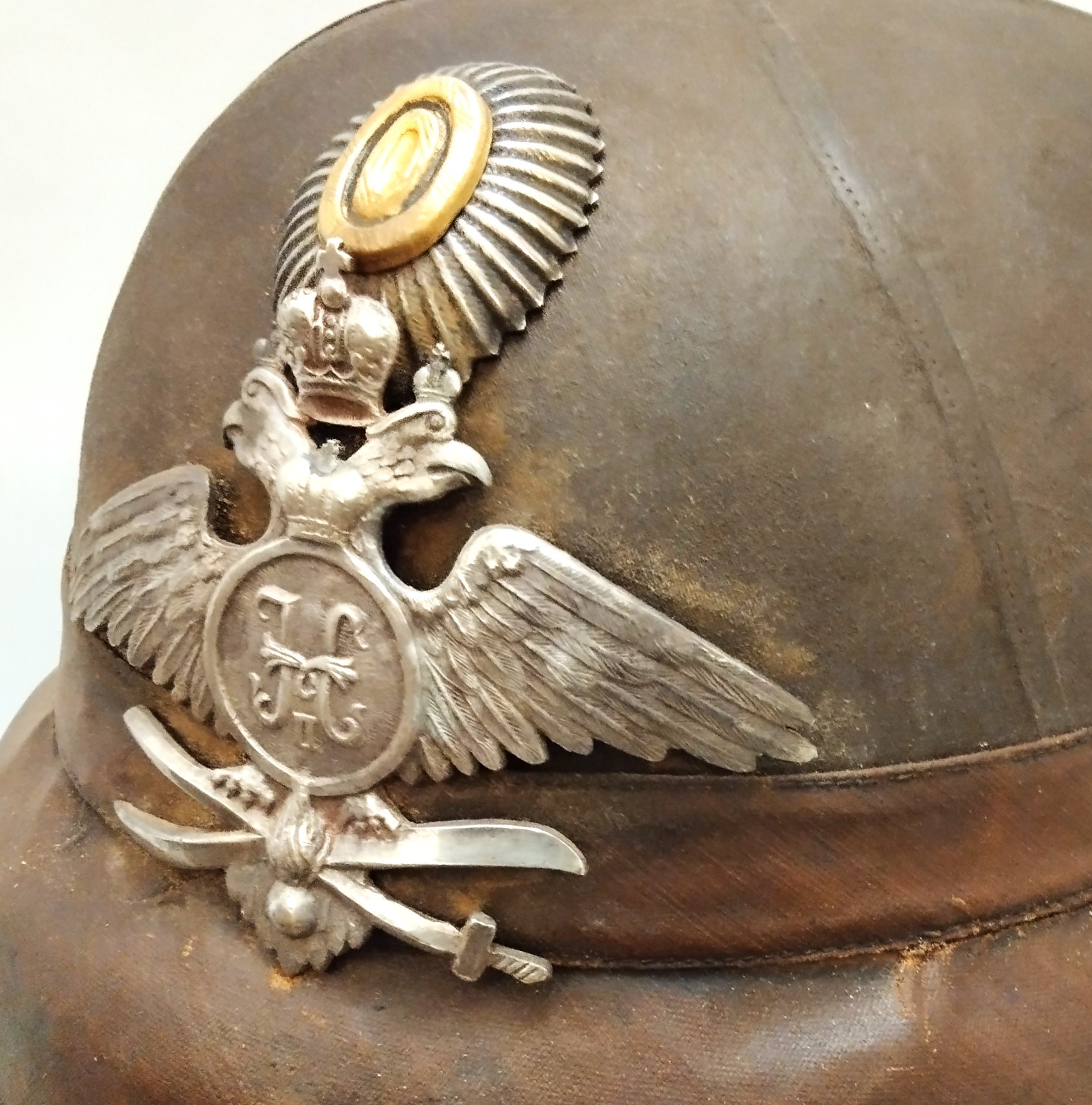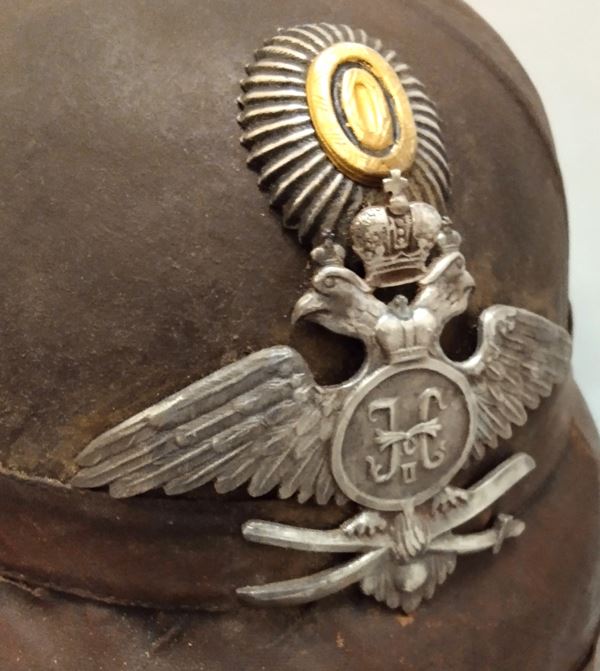 Rarissimo elmo Rold di fabbricazione francese con applicata frontalmente l'aquila imperiale russa su elica e coccarda ovale. In ottimo stato.