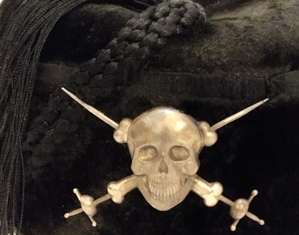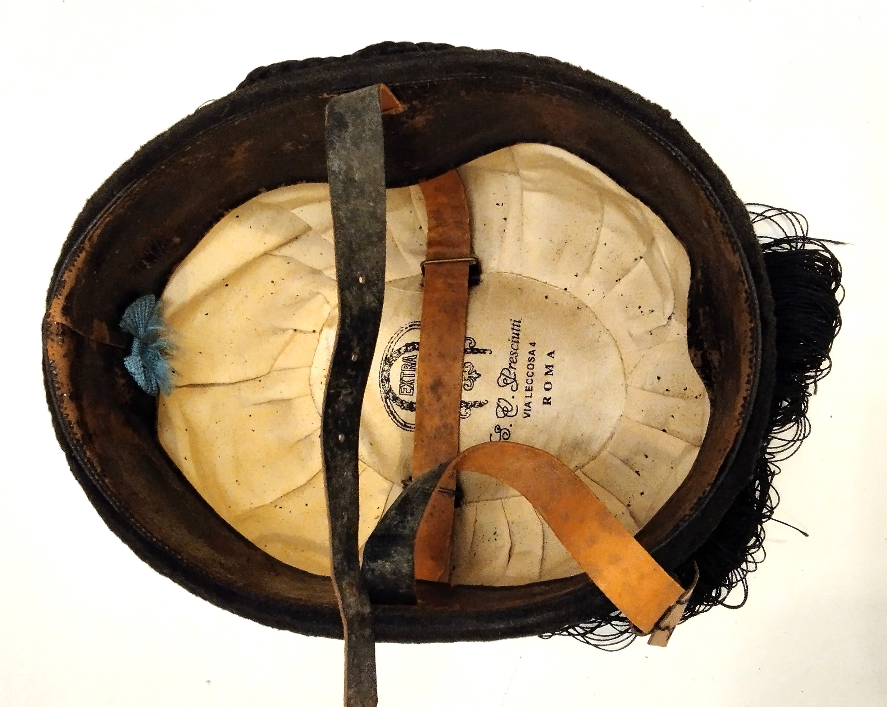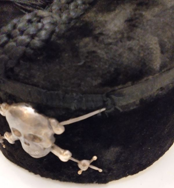 Fez colbac da moschettieri del Duce, corpo costituito e dedicato completamente alla salvaguardia di Benito Mussolini, Duce del fascismo. Corpo rigido di feltro ricoperto di velluto di seta, cordone di seta di forma specifica, fregio frontale in argento 800 non punzonato (testato). Lateralmente presenta il cordino reggi frangia, accessorio specifico per questo tipo di copricapo, all'interno cuffia di seta bianca con impresso il marchio del fabbricante "Presciutti - Roma" dotata di passanti per soggolo e soggolo in pelle. In buono/ottimo stato, molto bello e raro.