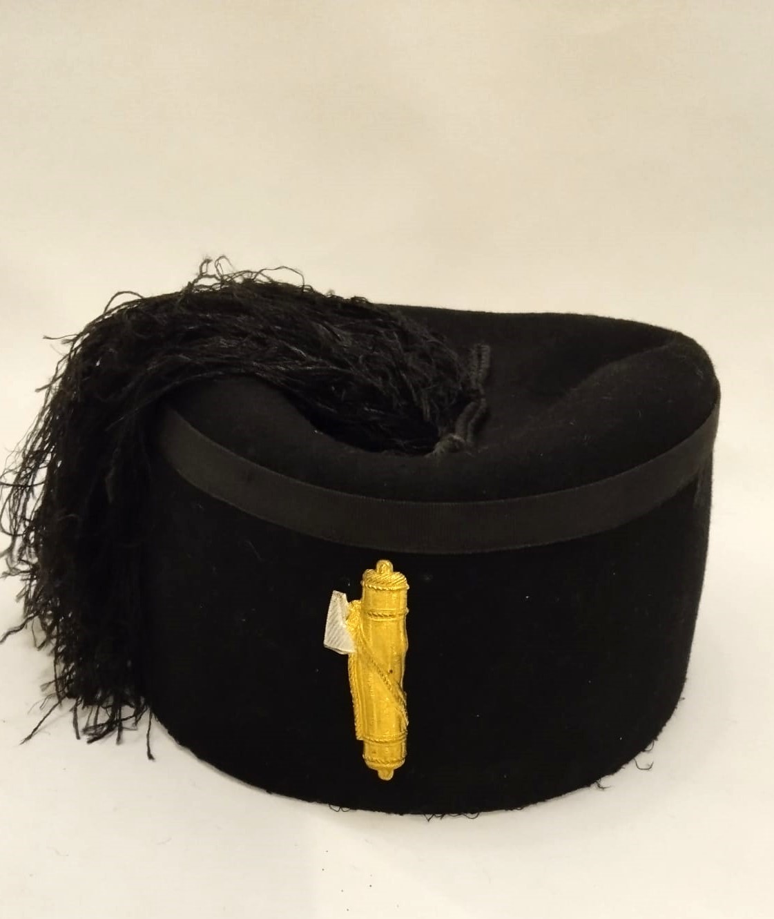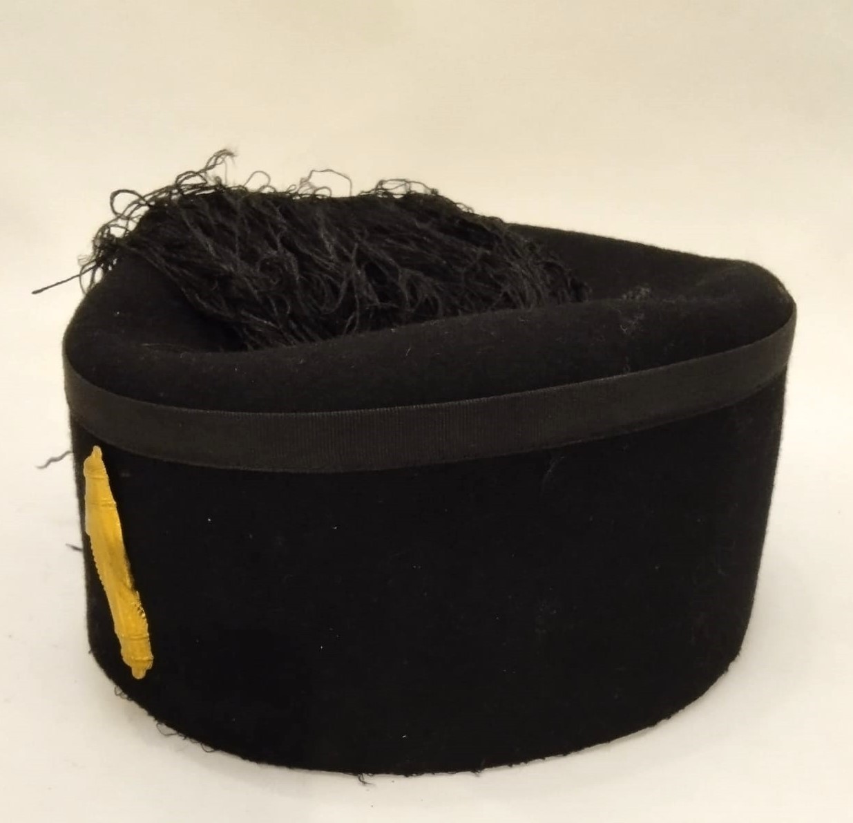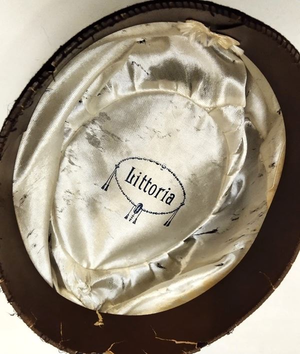 In felto con frangia di seta, fascio metallico frontale, con interno di seta marcato littoria ed alluda in pelle