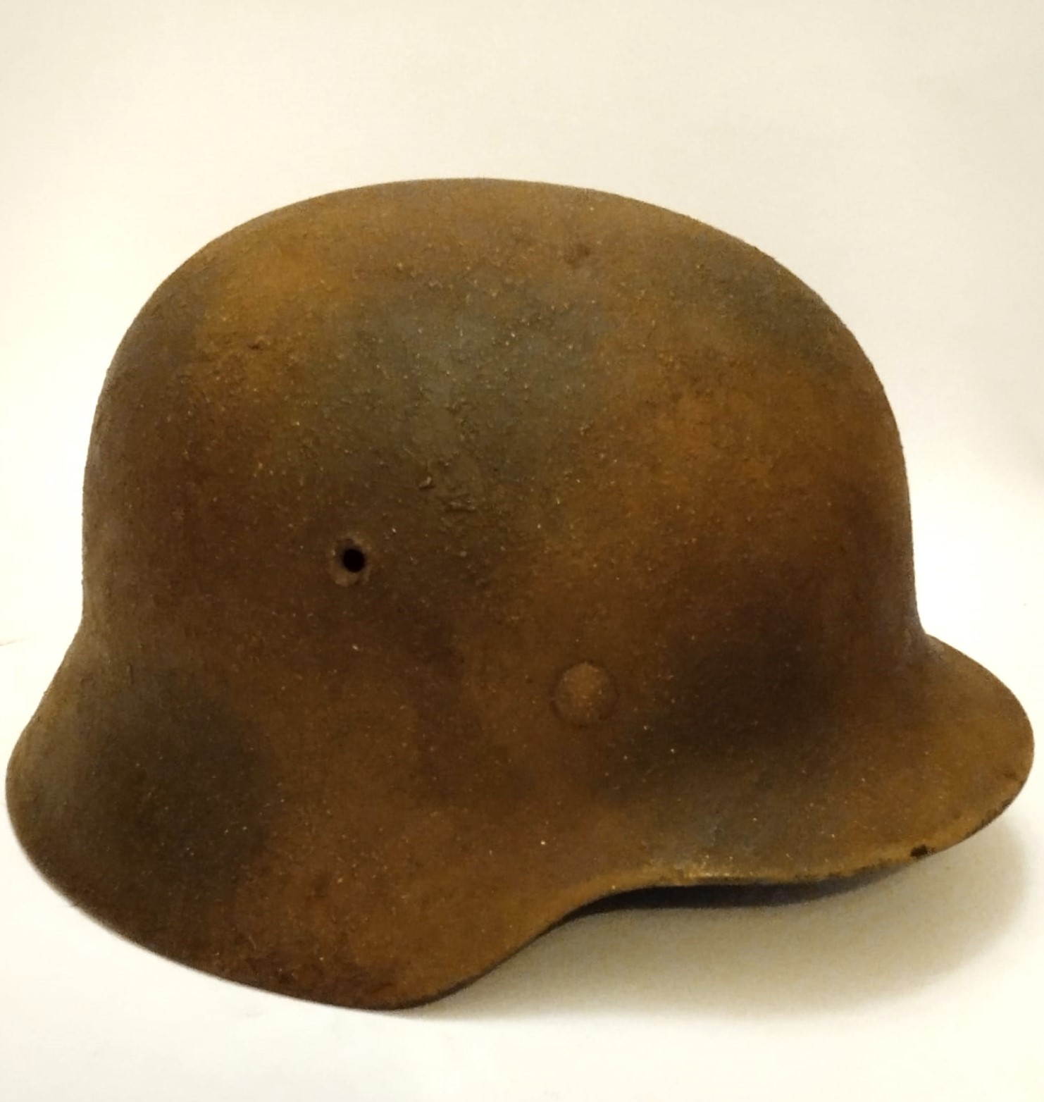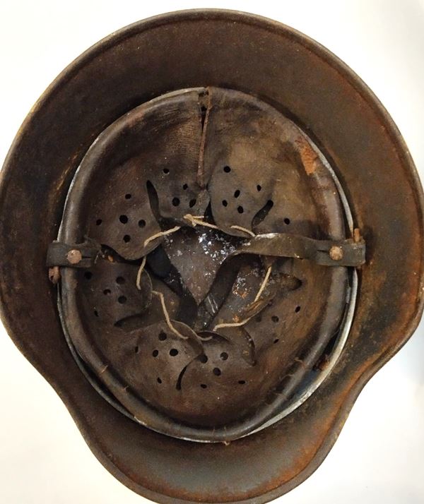 Elmetto m.40 con mimetismo ruvido a tre colori. Interno con ruggine da condensa, piccoli danni e mancanze al soggolo. In buono stato, con tracce di ruggine diffusa.