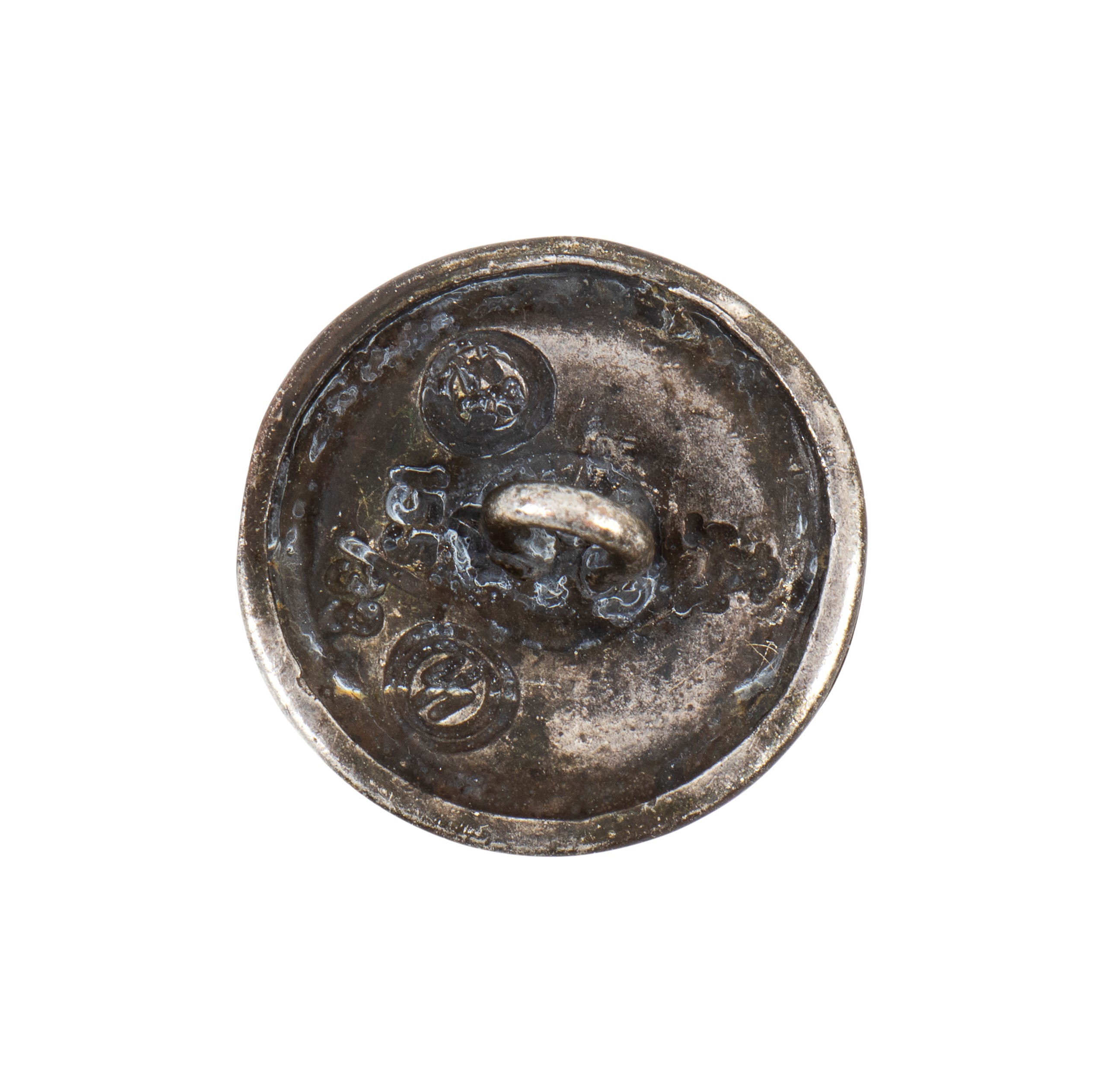 Raro bottone in metallo bianco con teschio in rilievo, marcato al verso, in patina