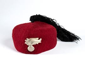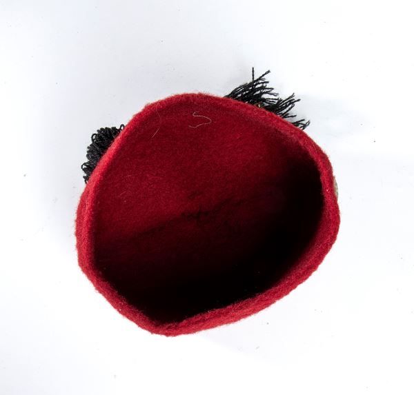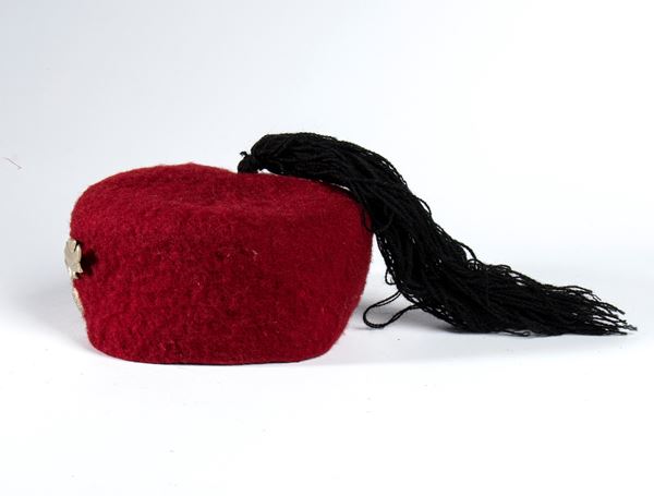 Rara Tachia per uno zaptié della Libia, feltro robbio con fiocco azzurro, fregio e coccarda. In buono stato.
