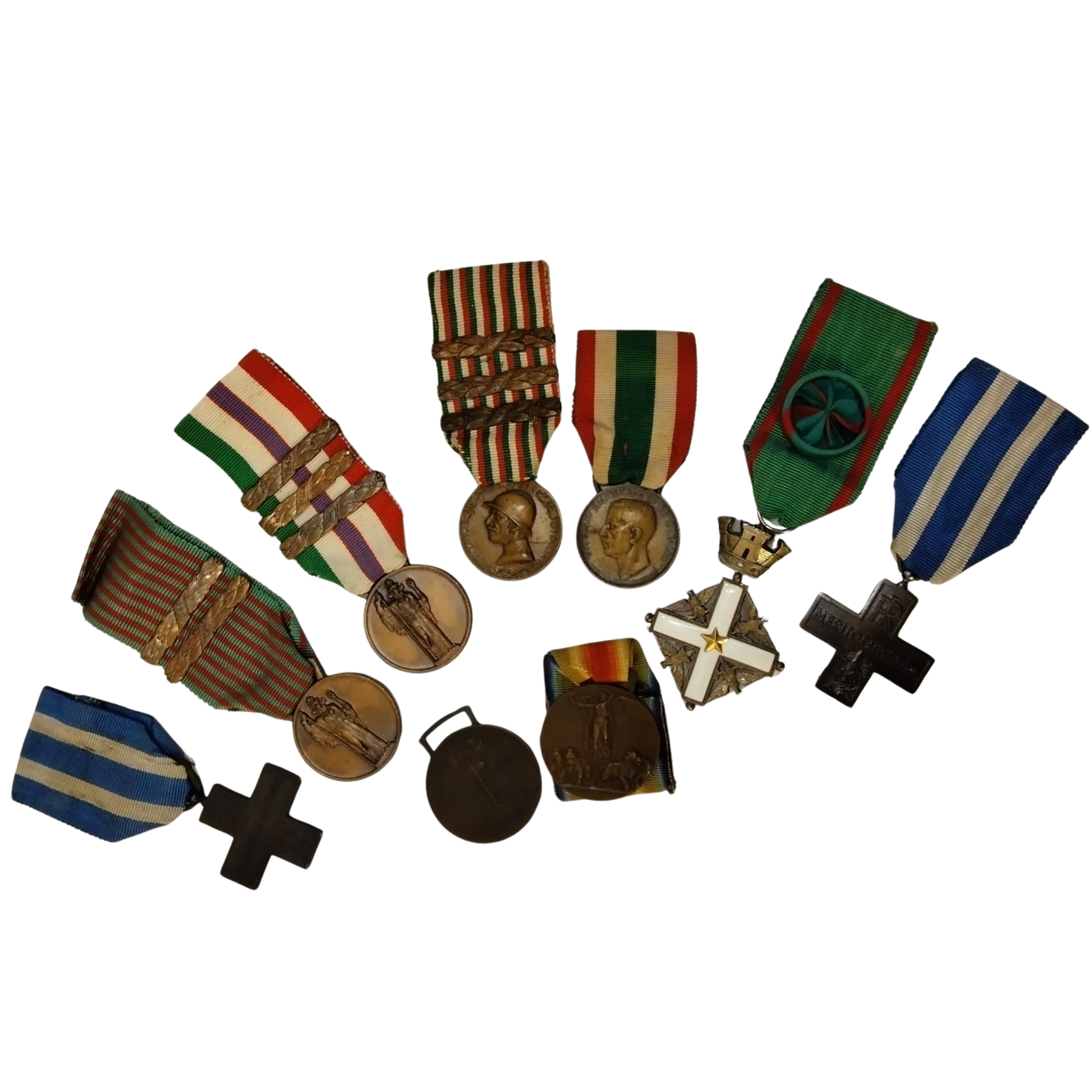 Lotto composto da otto medaglie, una commemorativa la grande guerra  con tre barrette, una guerra di liberazione con tre barrette, una campagna 40-45 con due barrette,due croci al merito di cui una RI e una VE,due interalleate di cui una senza nastrino e una unità d'Italia coniata ad opera dell'ass naz madri e vedove di guerra, in buono stato