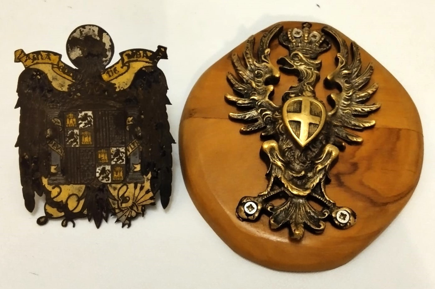 Aquila sabauda in metallo applicata su pannello di legno ed aquila spagnola del primo periodo del governo di francisco Franco in metallo brunito con tracce di vernice, in buono stato