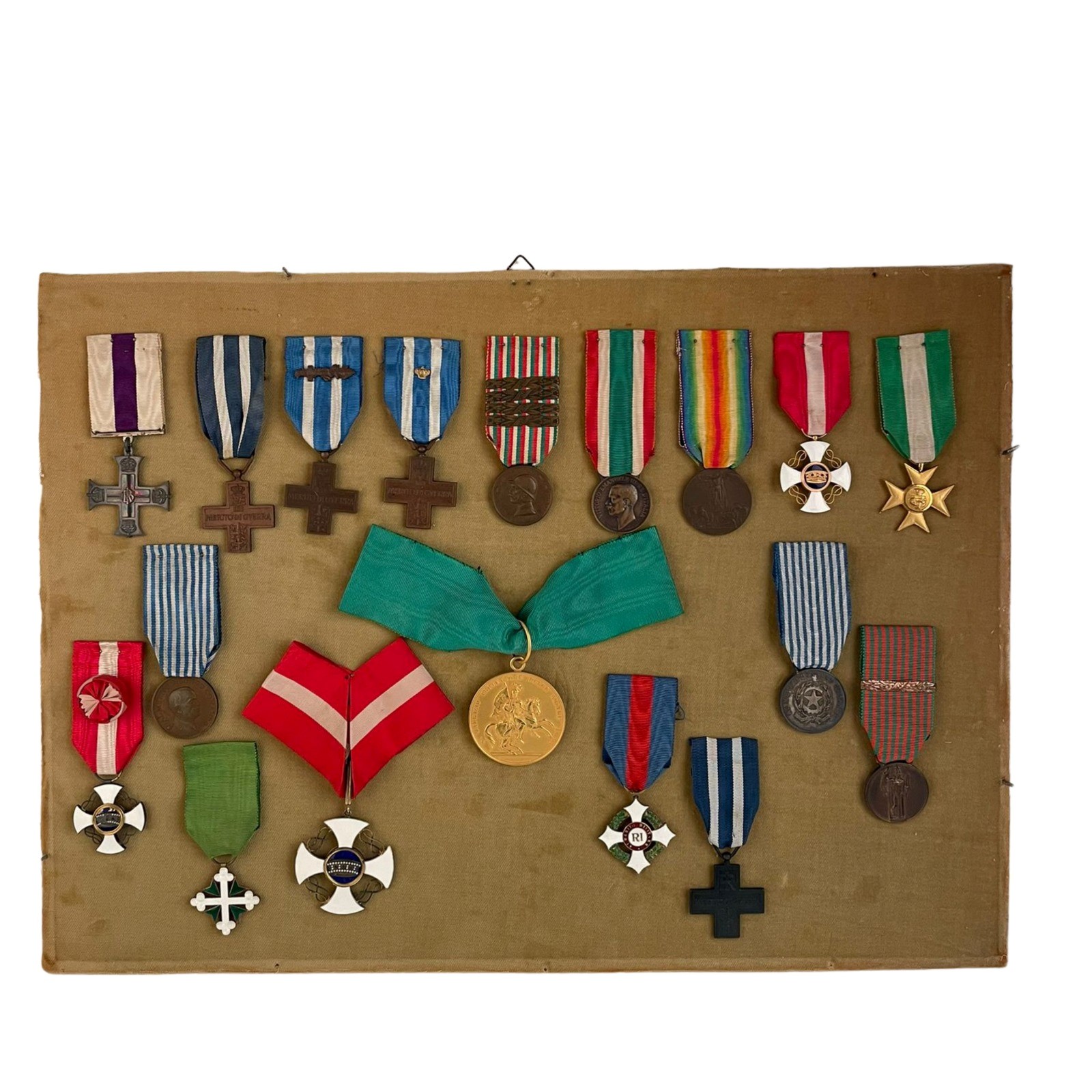 Medagliere composto da medaglia Mauriziana per dieci lustri di carriera nell'esercito emessa dalla zecca in oro 917/1000, Military Cross, decorazione raramente concessa dal Regno Unito agli ufficiali dei paesi alleati, Ordine Militare d'Italia, insegna di Cavaliere in oro. Ordine della corona d'Italia, insegna di commendatore in argento, cavaliere in oro e cavaliere ufficiale in argento. Ordine dei SS Maurizio e Lazzaro, insegna di cavaliere, medaglia al merito di lungo comando VEIII in bronzo incisa, una RI non incisa. Tre croci al merito di guerra VE III e una RI, una croce di anzianità in bronzo dorato e medaglie di campagna, in ottimo stato, in cornice.