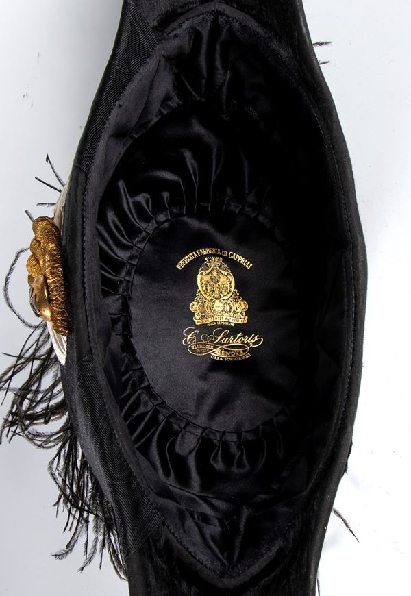 Feltro nero con applicazioni in canottiglia, coccarda e bottone. In buono stato.