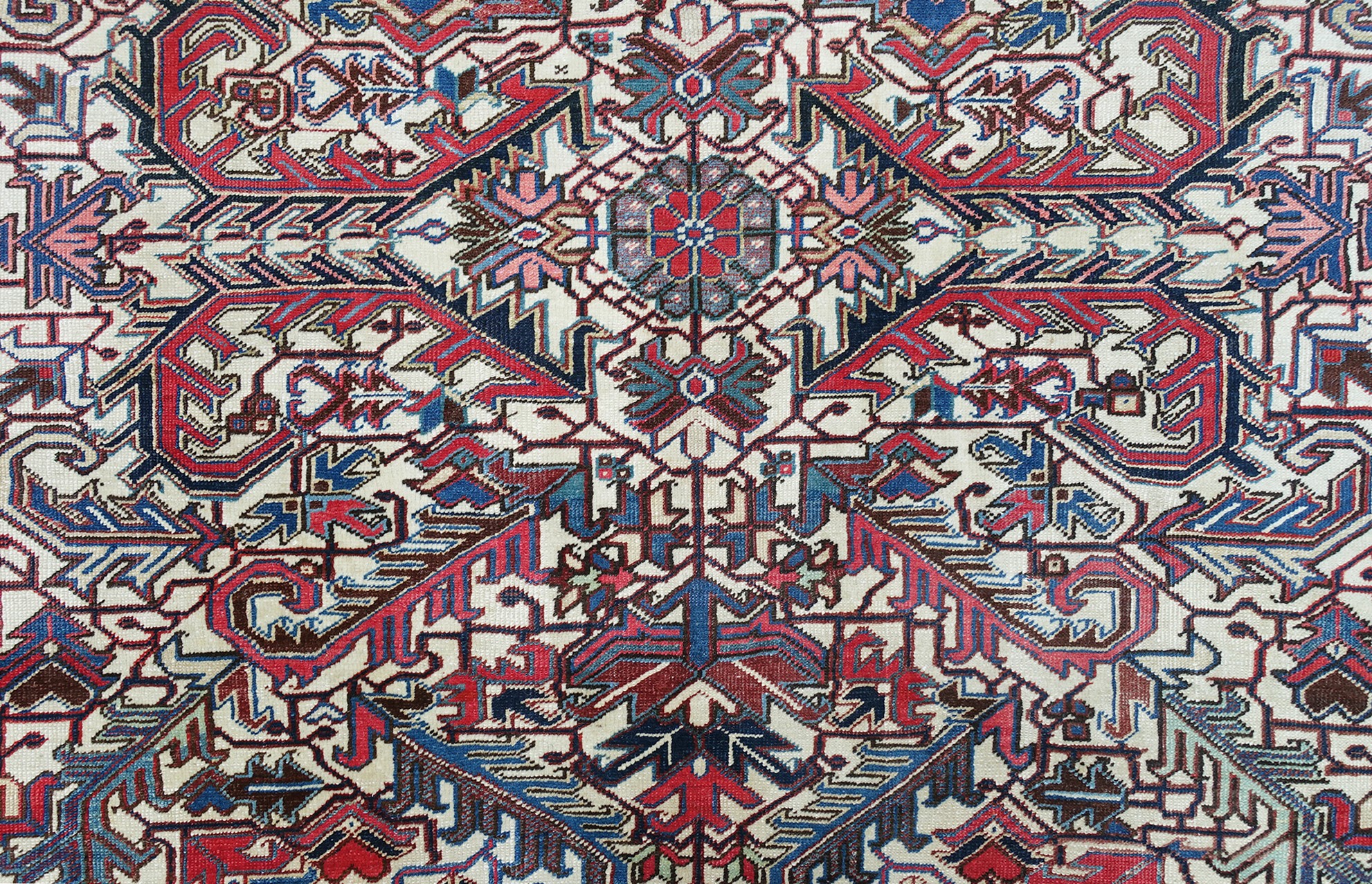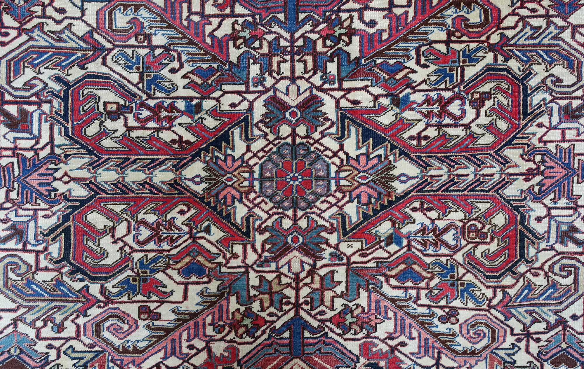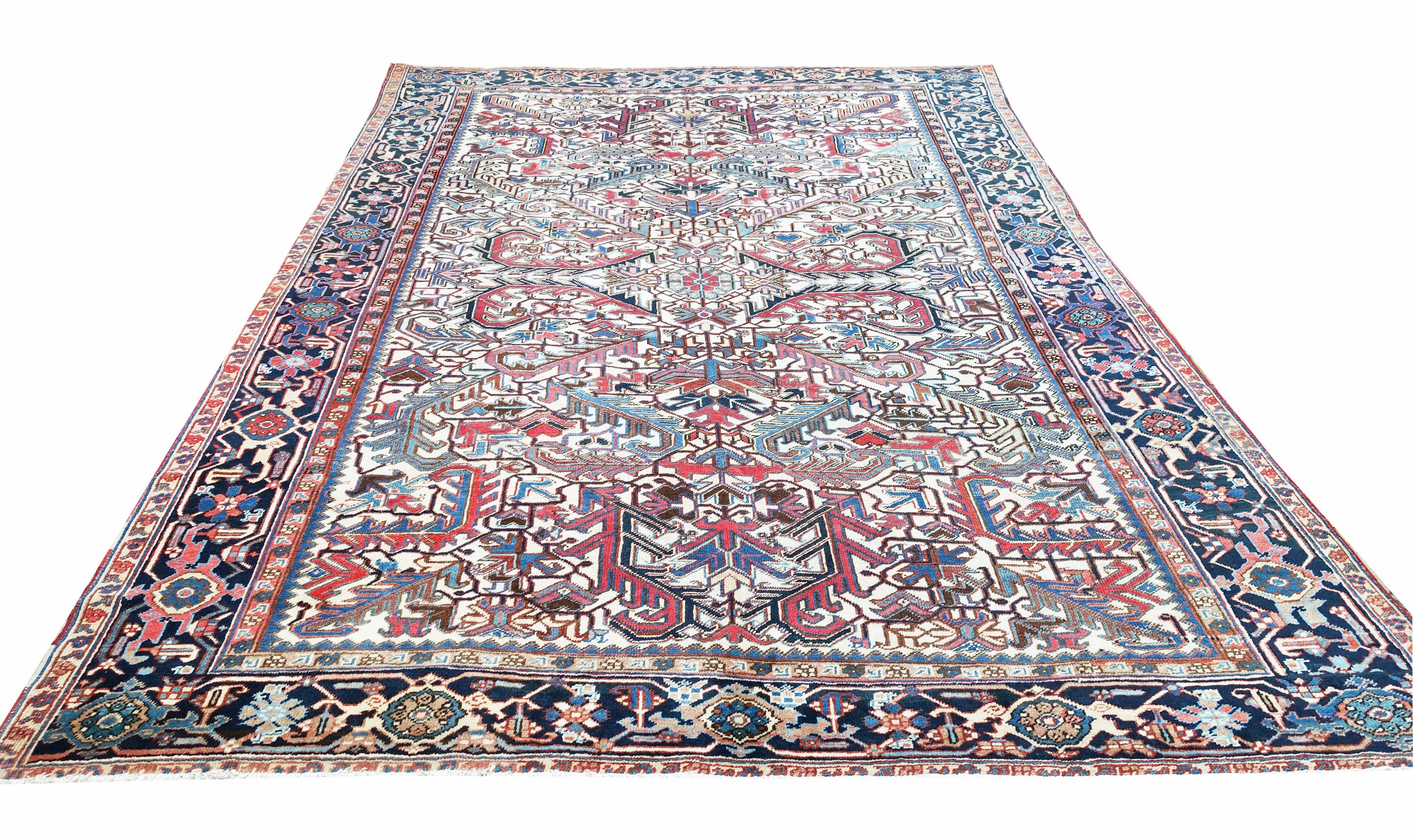 The white background of the inner field is all over patterned with geometrized floral ornamentation. A large “Herati”-border ornates the main border.