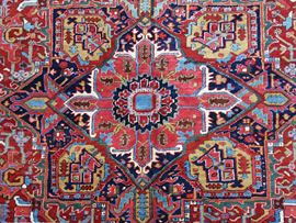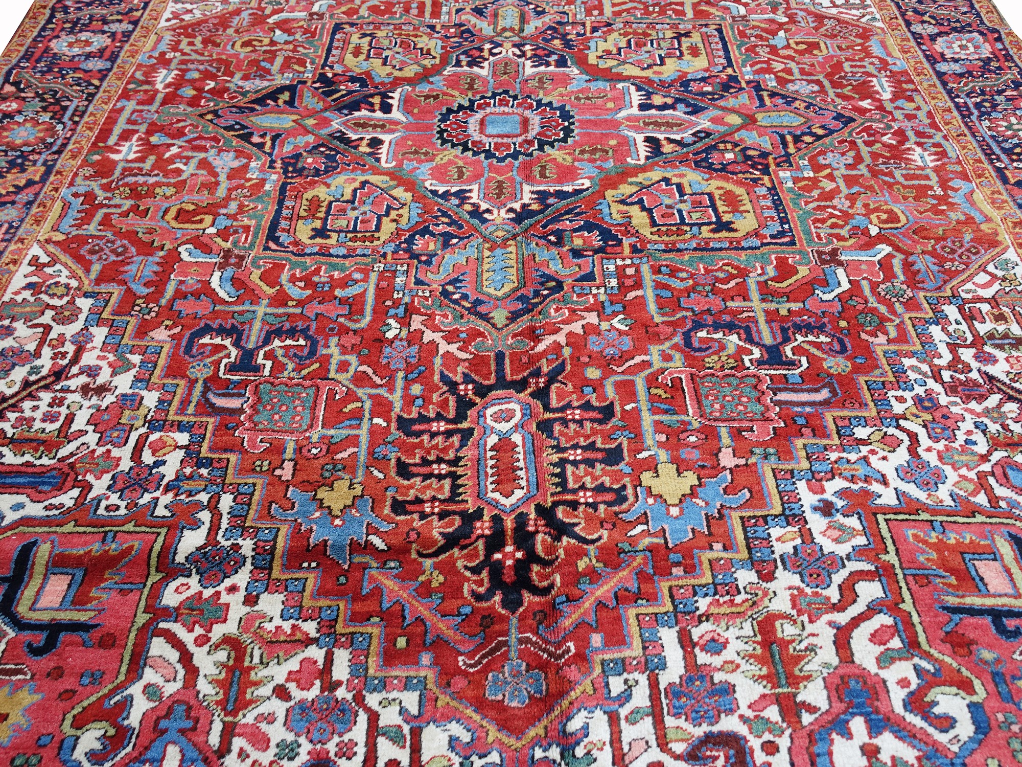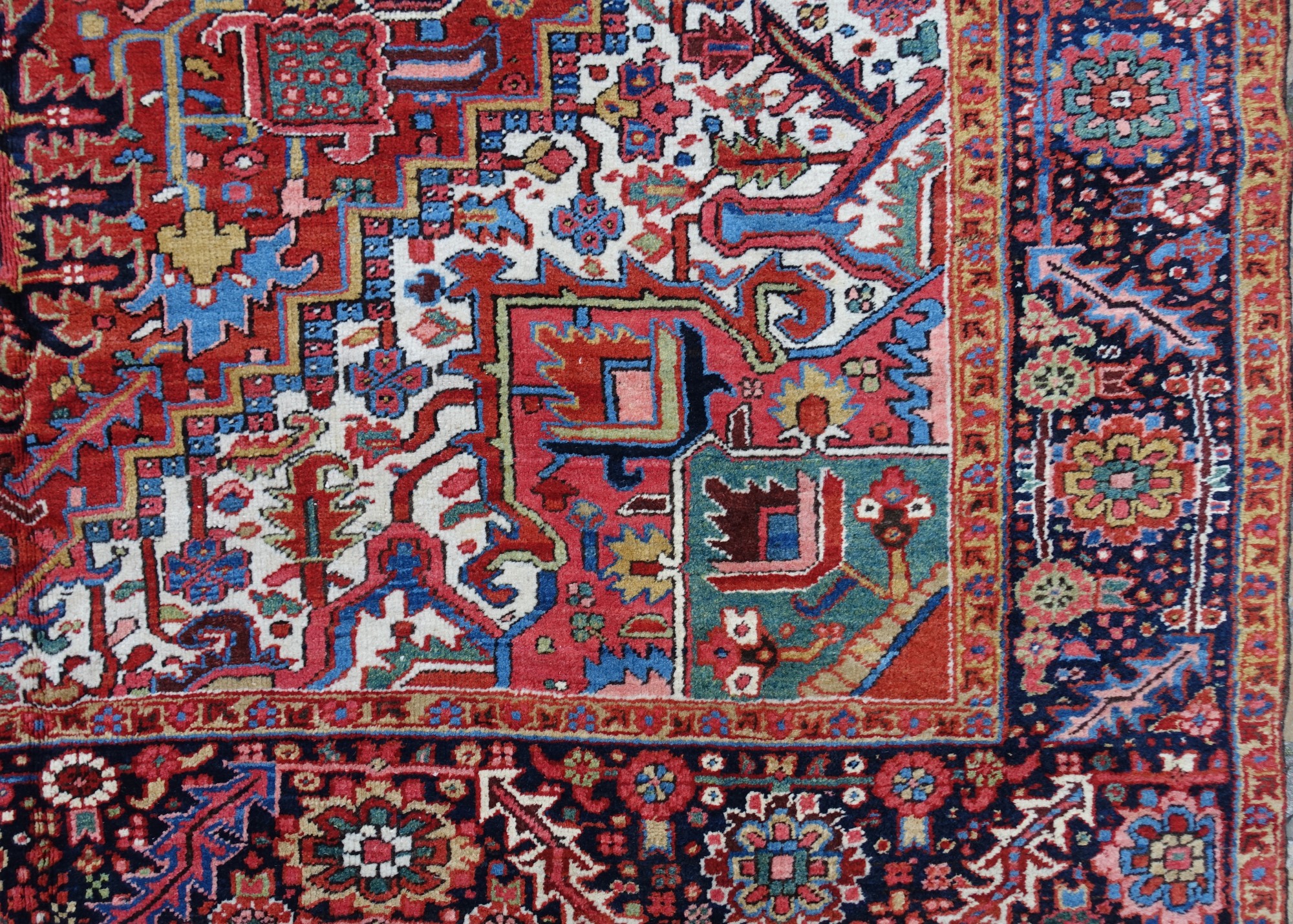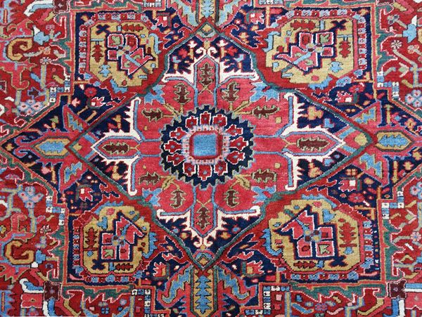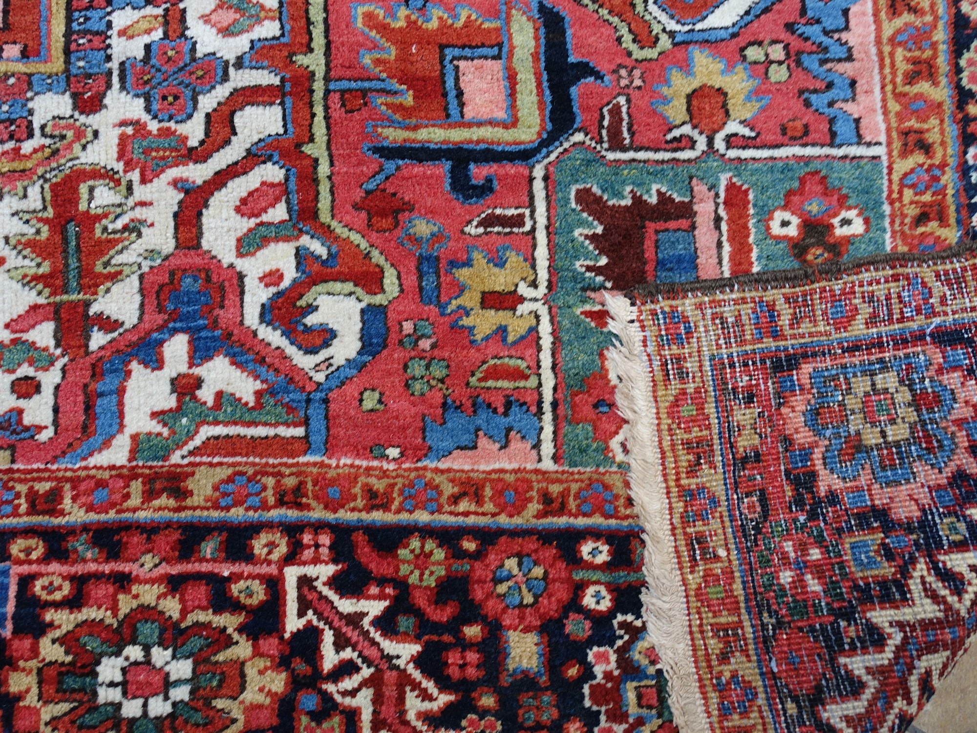 A classical Heriz medallion carpet with geometrized floral designs. The carpet is very well preserved and has a very attractive vivid color scheme.