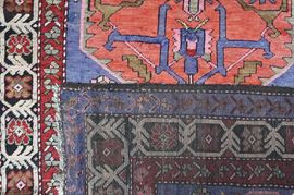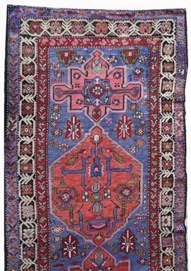 Three medallions in alternating shapes dominate in pinkish rose color the violet colored field. Geometrized floral border design.