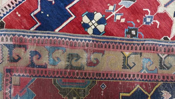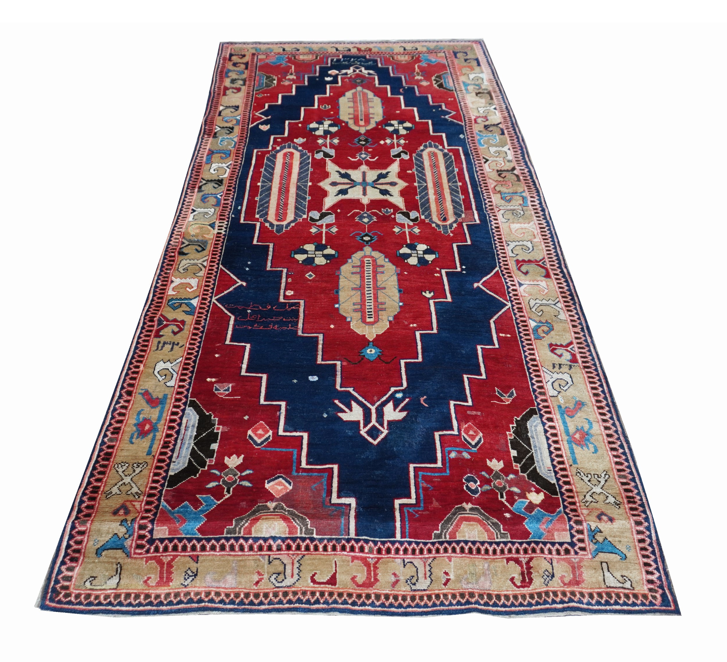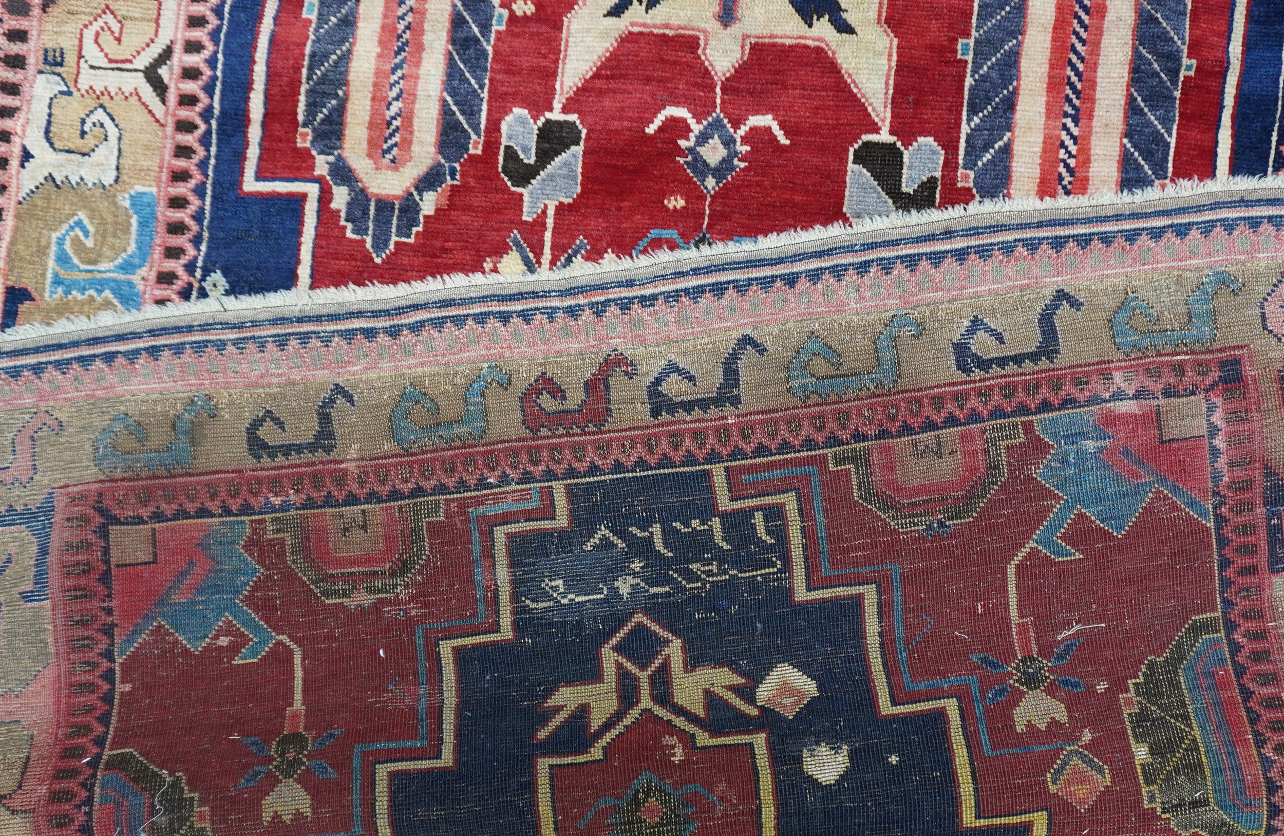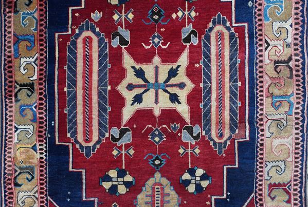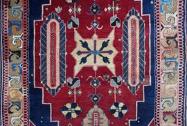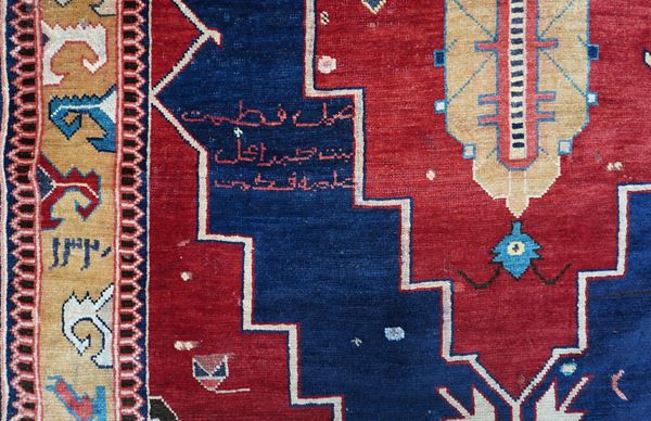 A large, monumental medallion with stepped outlines dominates in red the dark blu field. The medallion and the edges are decorated with geometrized ornaments. Border design with archaic expression that reminds pieces of the Avar region. Several inscriptions, among them a dating 1328= 1910.
