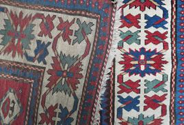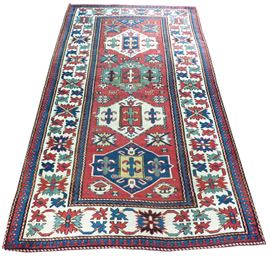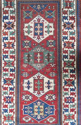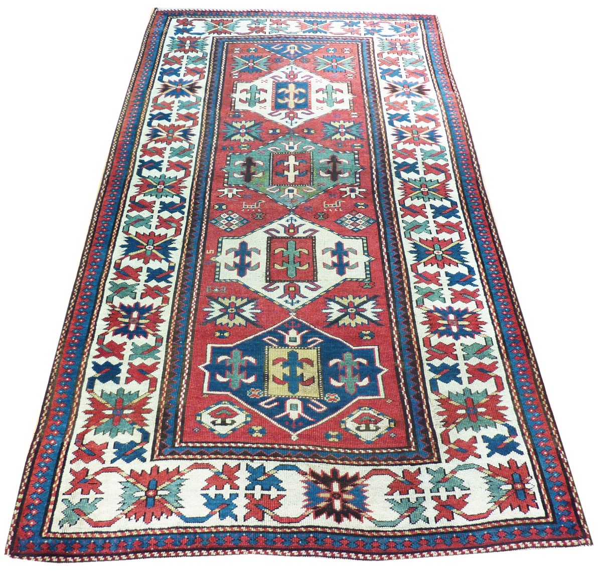 Several geometric medallion stand out the red field in vivid colors, as for example white, green and blue. A large main border with white background surrounds with large geometrized flower designs.