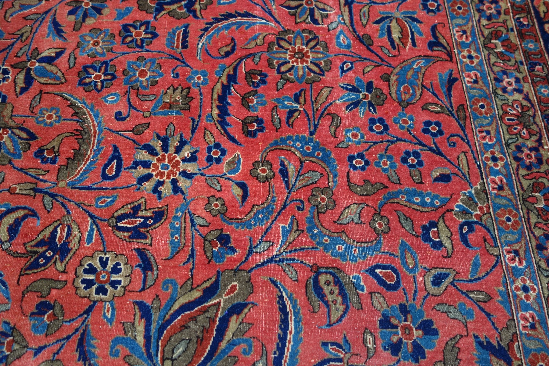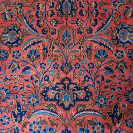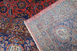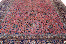A complex pattern systems covers the red background field, composed of curved leafs, palmetts, gracile flower branches and arabescated cartouches. Main border with scorlling flower and palmett ornamentation. The Manchester Kork wool pile confers the piece a soft and velvet like touch.