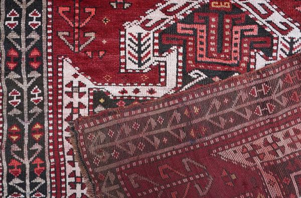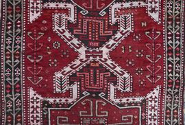 Three monumental shield ornaments with Sevan design dominate the bordeaux colored field. The border is decorated with a continous ornament of geometrized trees.