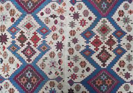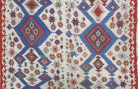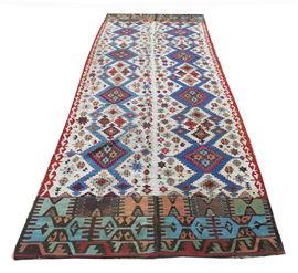 Two panels, woven seperately, are sewn together to create this classical anatolian Kilim. Large, archaic motifs in indigo blue stand out the white field. Varied geometric motifs decorate the tribal weaving.