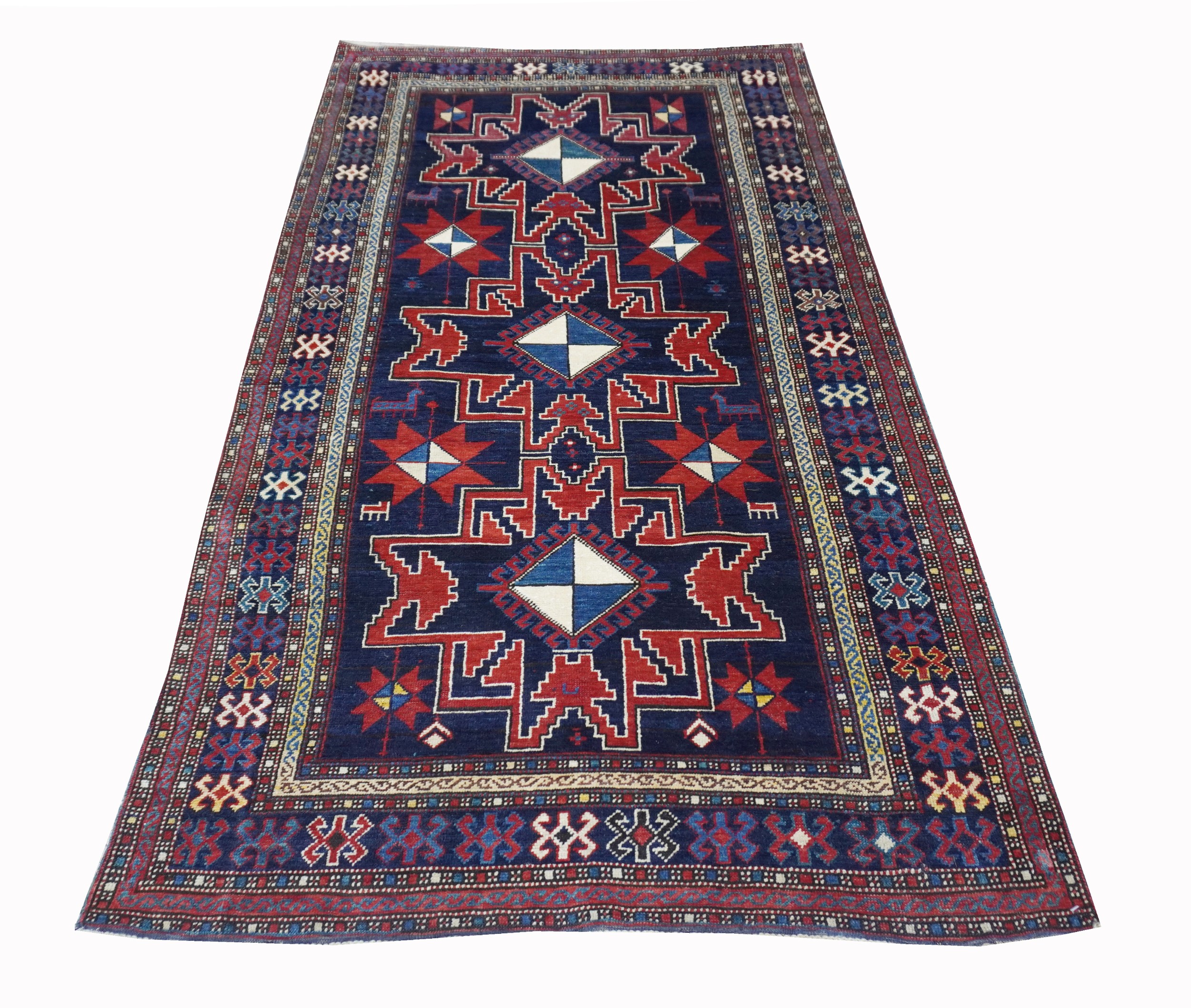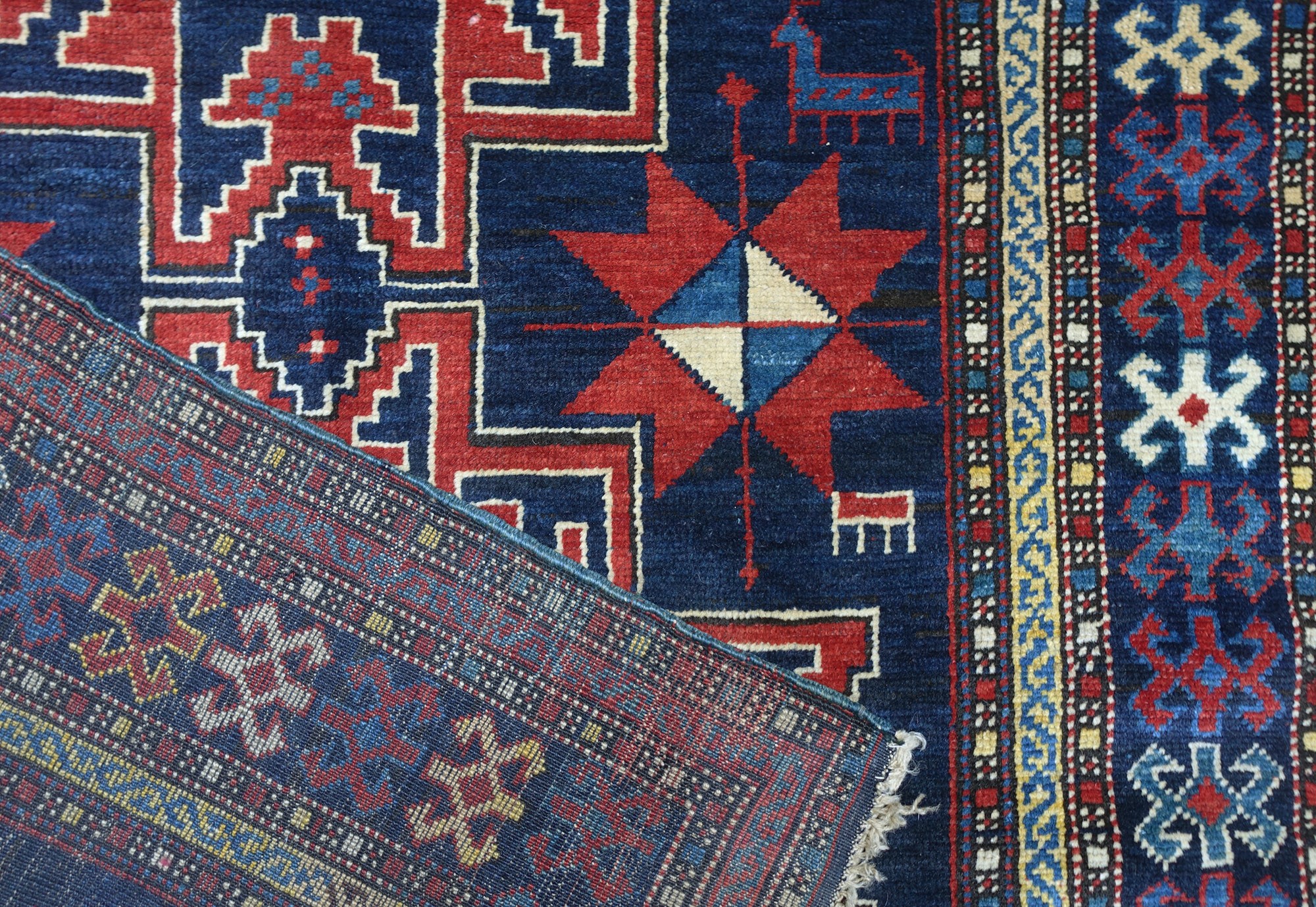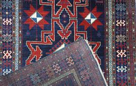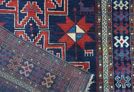 Three red background Leshy star motifs outlined in white wool create a pleasant contrast to the dark blu background of the center field. Border design with geometrized, hooked ornaments. High pile.