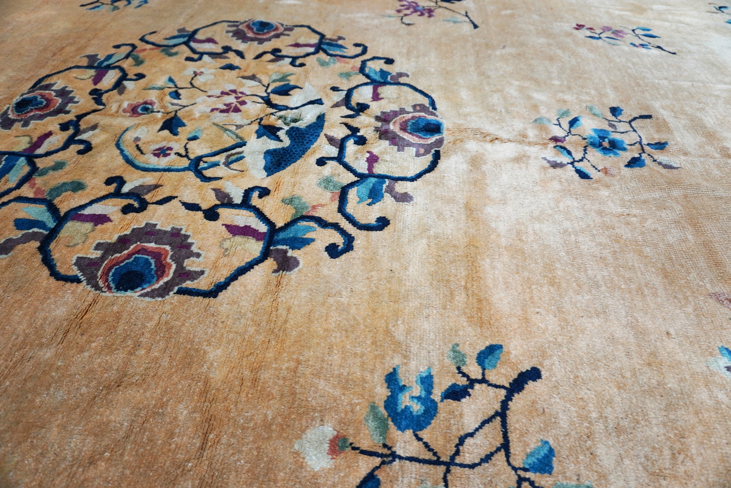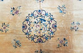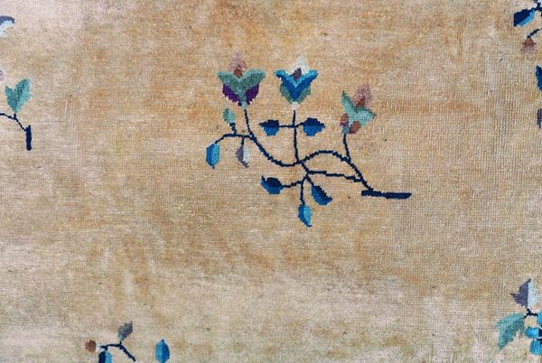 The light apricot colored field is ornated with gracile flower branches and a central medallion composed of intricated scrolls. A light blue border frames this elegant piece of calm expression.