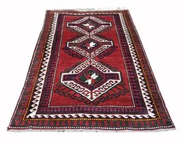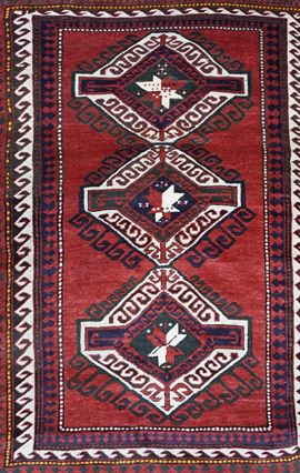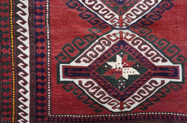 Three white background, hexagonal medallions with hooked outlines and inscribed star motifs dominate the warm red color of the center field. The border consists of reciprocal, geometric design. Powerful expression.