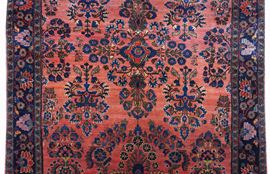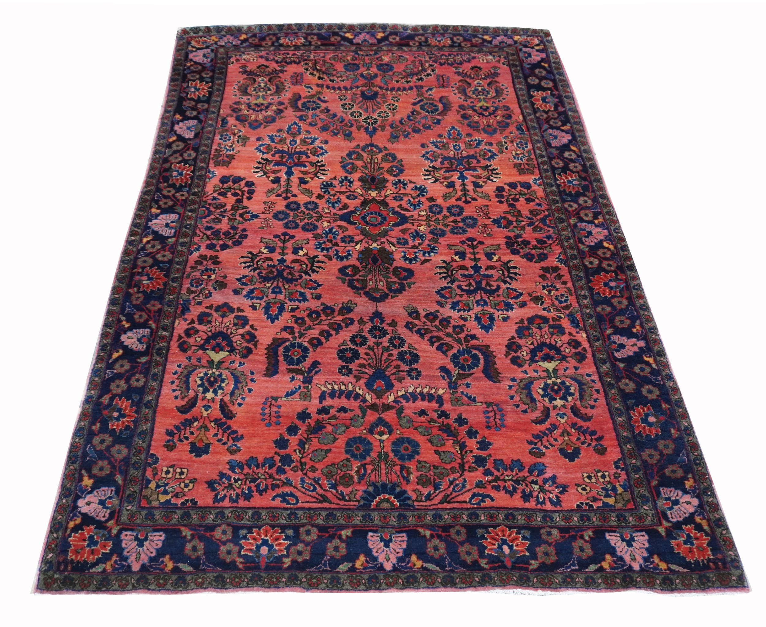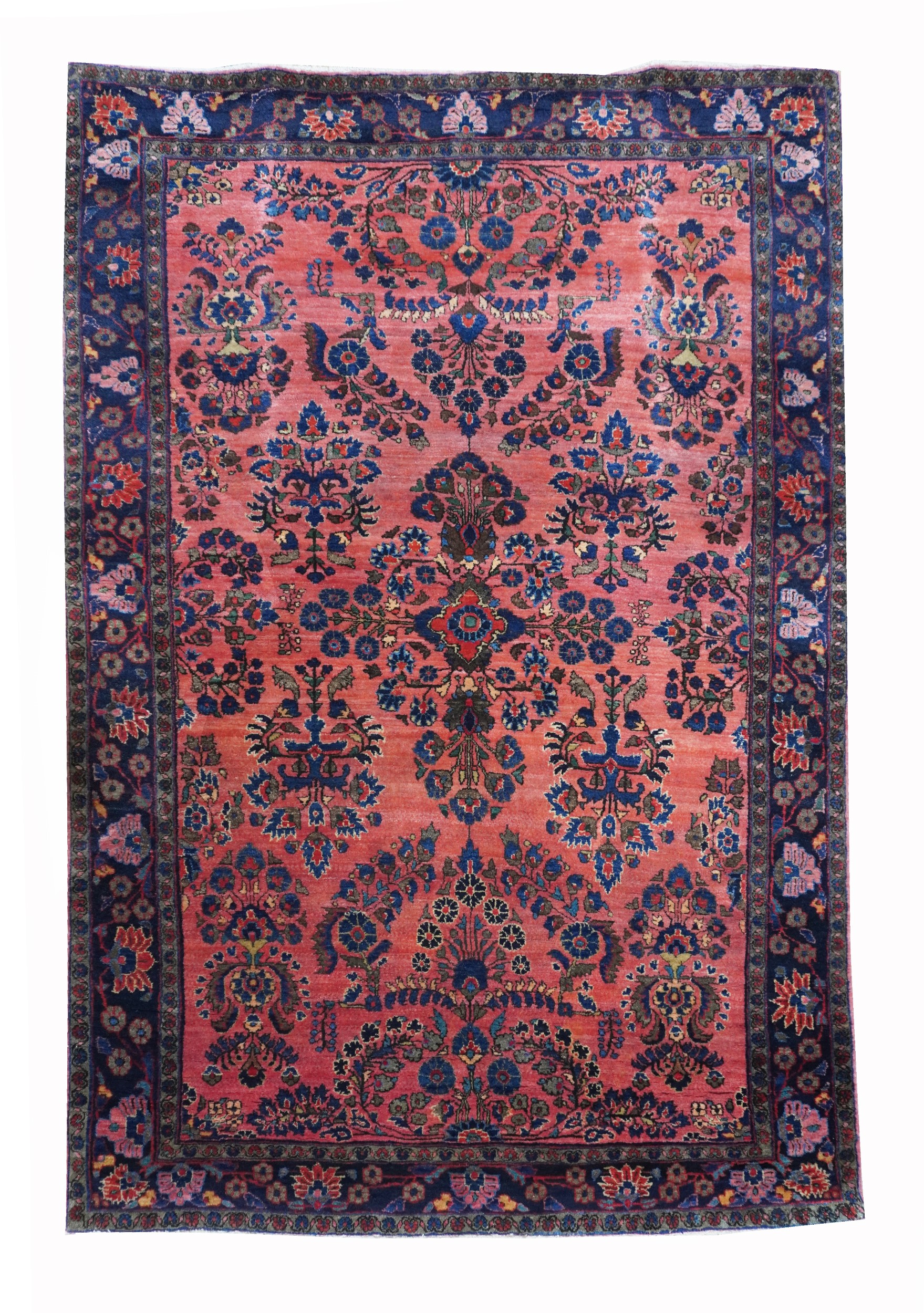 This Sarouk rug belongs to the group of reimport pieces and is caratterized by excellent Manchester Kork wool pile and fine weaving. The ornamentation is based on elegant floral patterns. Blue background main border.