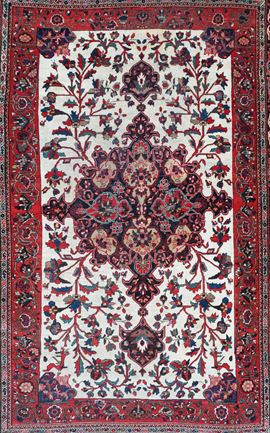 A finely woven Saruk-Farahan rug which displays elegant and gracile floral ornamentation on a white background. Blue background colored medallion with pendants.