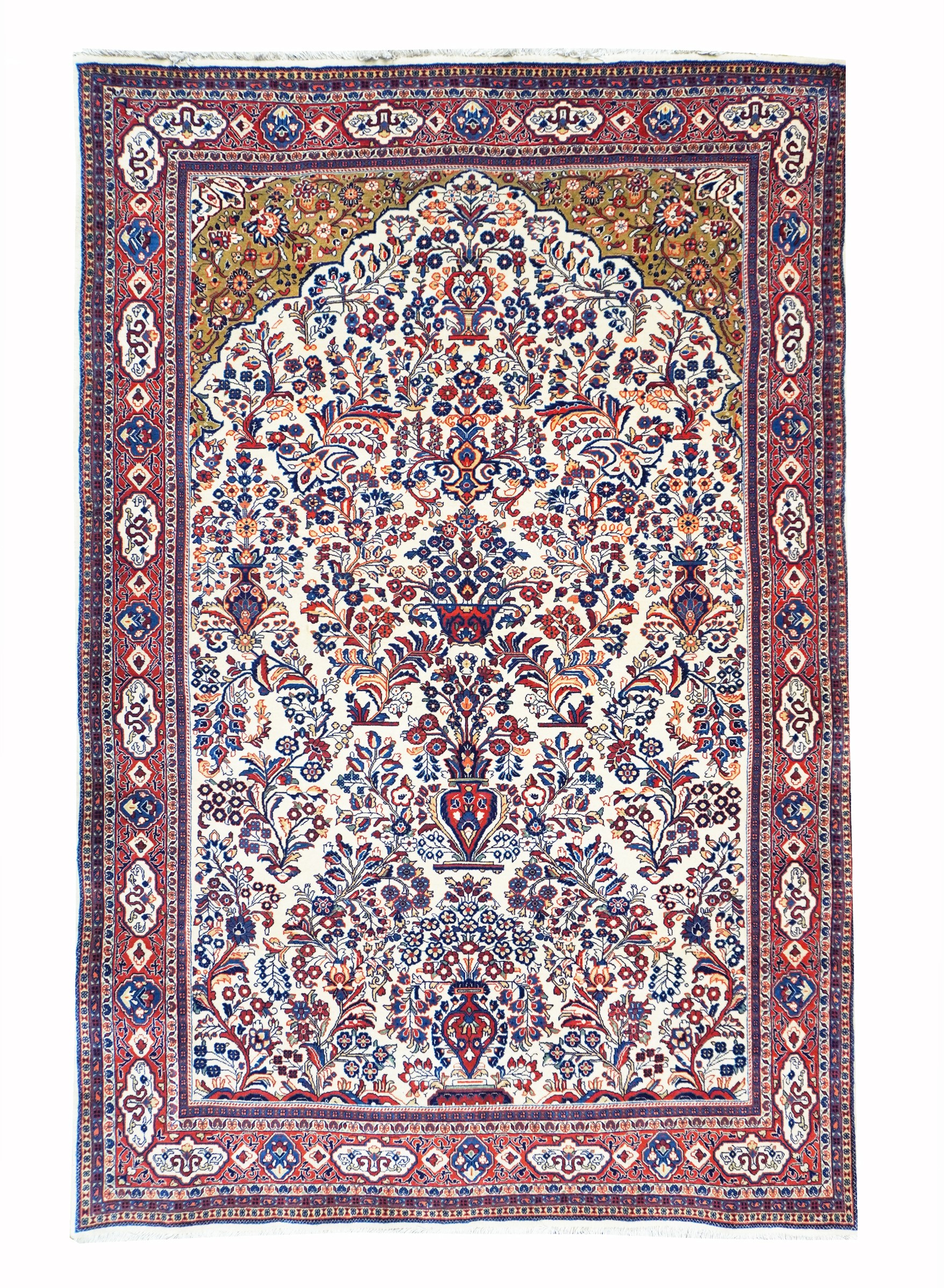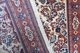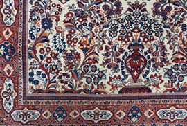 The field with “mihrab” prayer niche is decorated with curved flowers and branches and vase motifs on a beige field. The main border displays on red background cartouches with flowers and stylized clouds. The soft kork wool pile contributes to the elegant character of the piece.