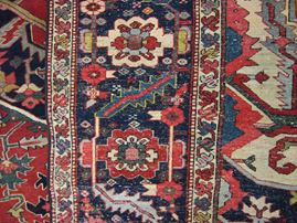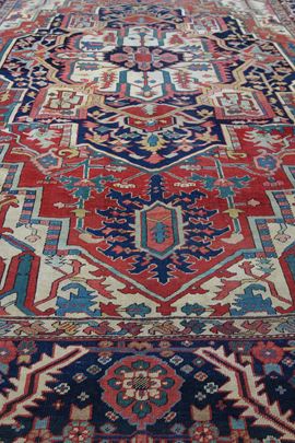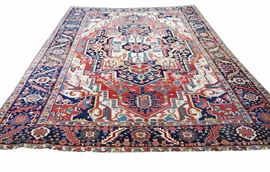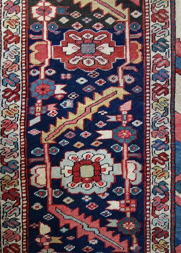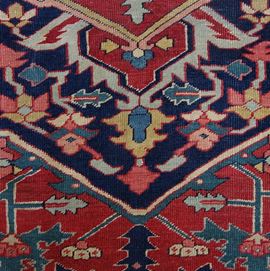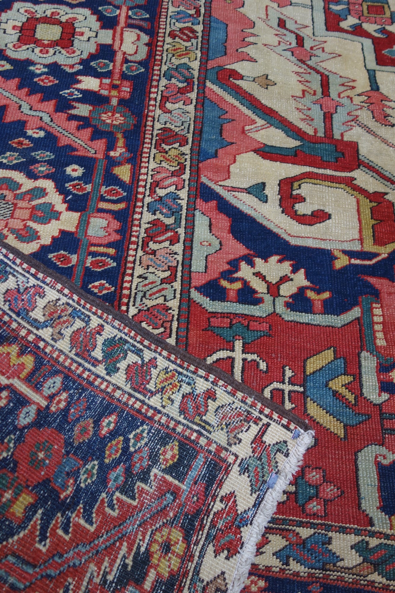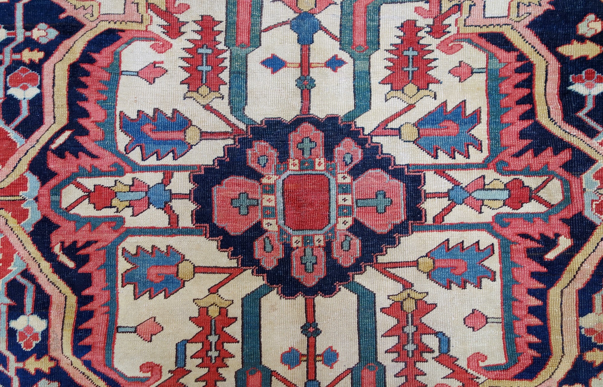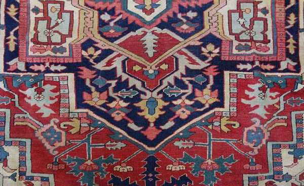 A Serapy carpet with classical design features: The star shaped medallion is surrounded by geometric flowers, stilized branches and palmettes. The piece is caratterized by a luminous and bright color scheme that contributes to the powerful expression of the piece.