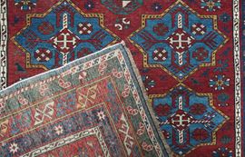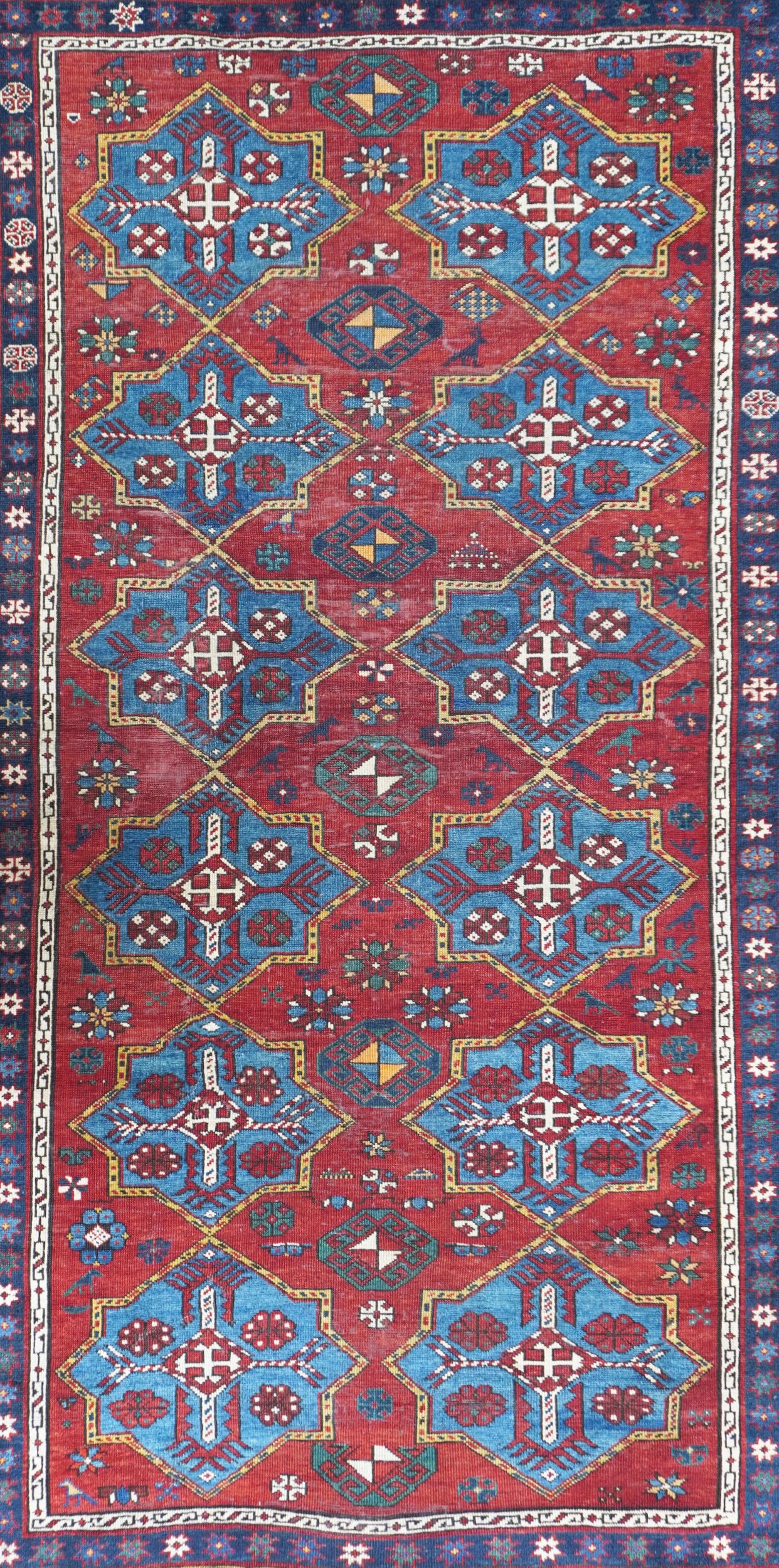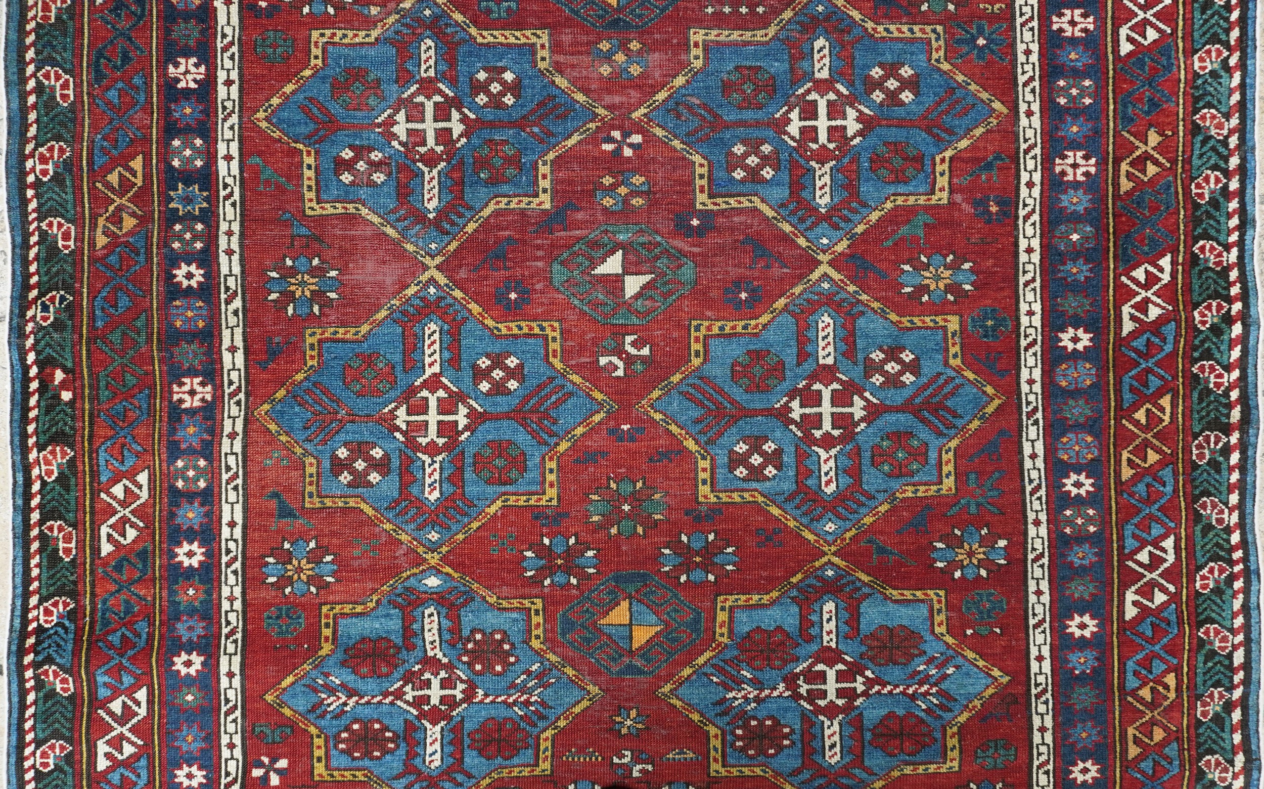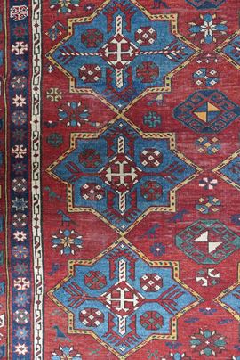 Two rows of stilized star motifs cover in light blue the vivid red background of the inner field. The border frame consists of a flower border, a border with star ornaments and a main border with geometrized ornaments.