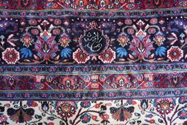 The white background is all over pattered with gracile flower ornamentation. The light colored field is contrasted by a border frame with red and blue colored background. Signature cartouche within the border.